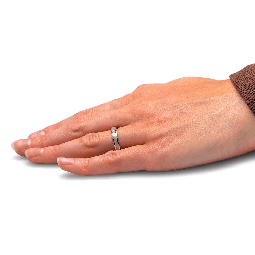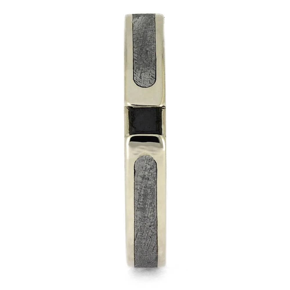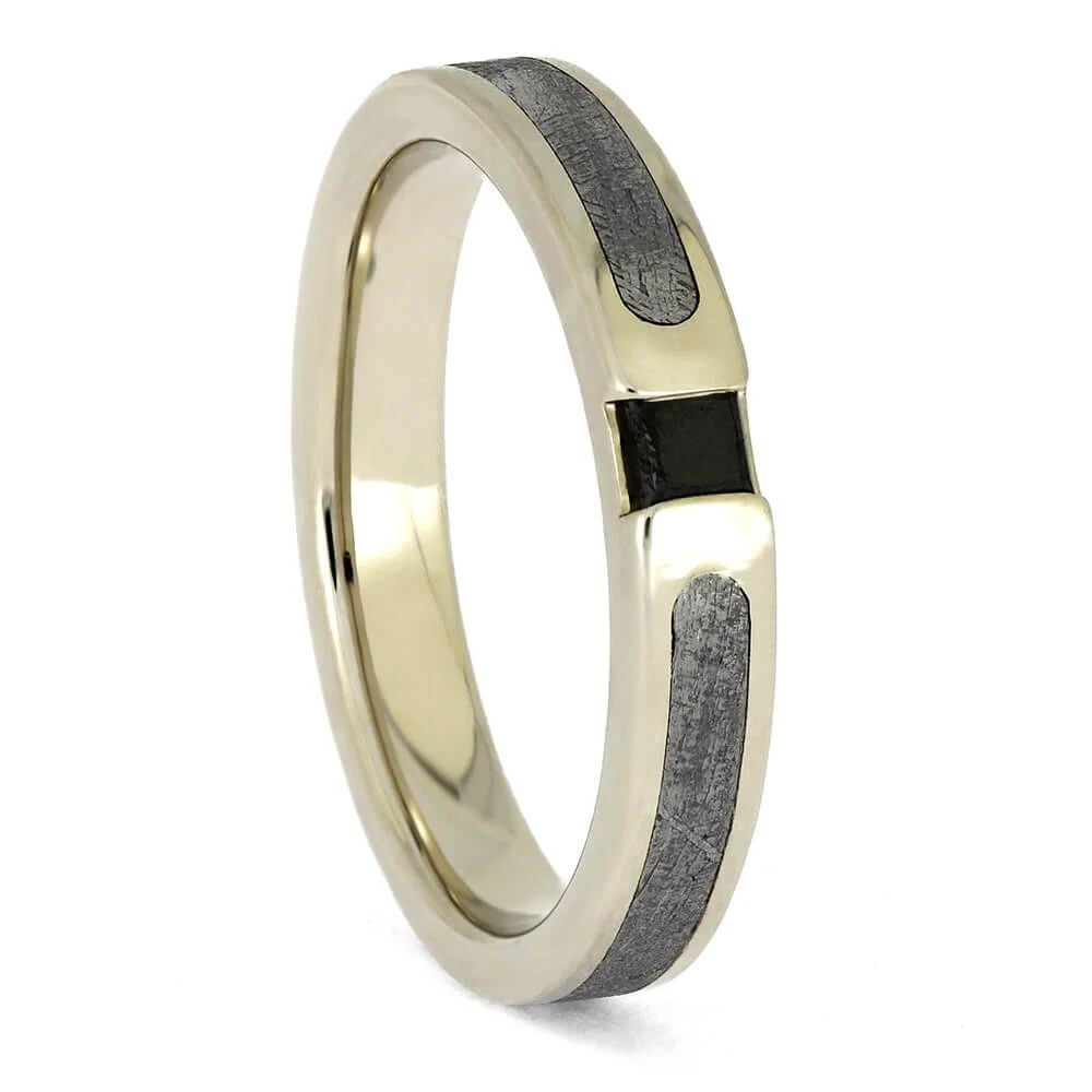 This 14k white gold wedding band or engagement ring features a striking square-cut black diamond at its center. The natural meteorite has been etched to reveal the distinct Widmanstatten patterns that wrap around the entire ring, adding a unique, space-inspired touch.