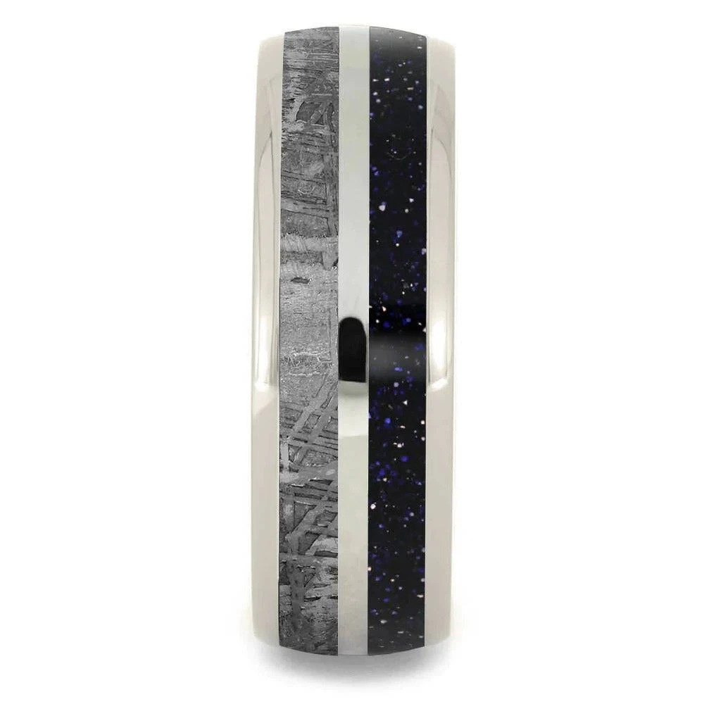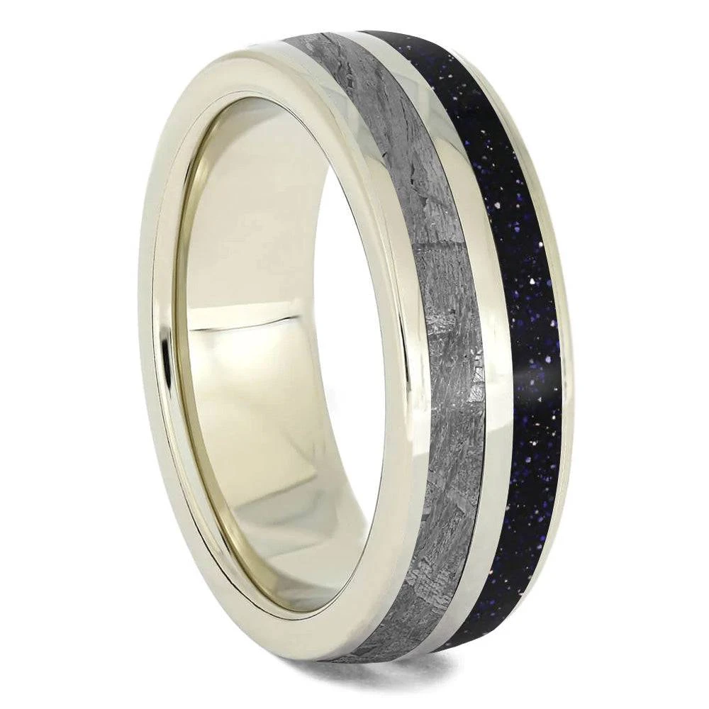 This meteorite wedding band is perfect for the bride or groom who loves to stargaze! On one side of the white gold pinstripe is authentic Gibeon meteorite. The other unique material featured is sparkling blue goldstone. Handcrafted in solid gold with a polished finish or customize it with a different finish and/or metal, if desired.