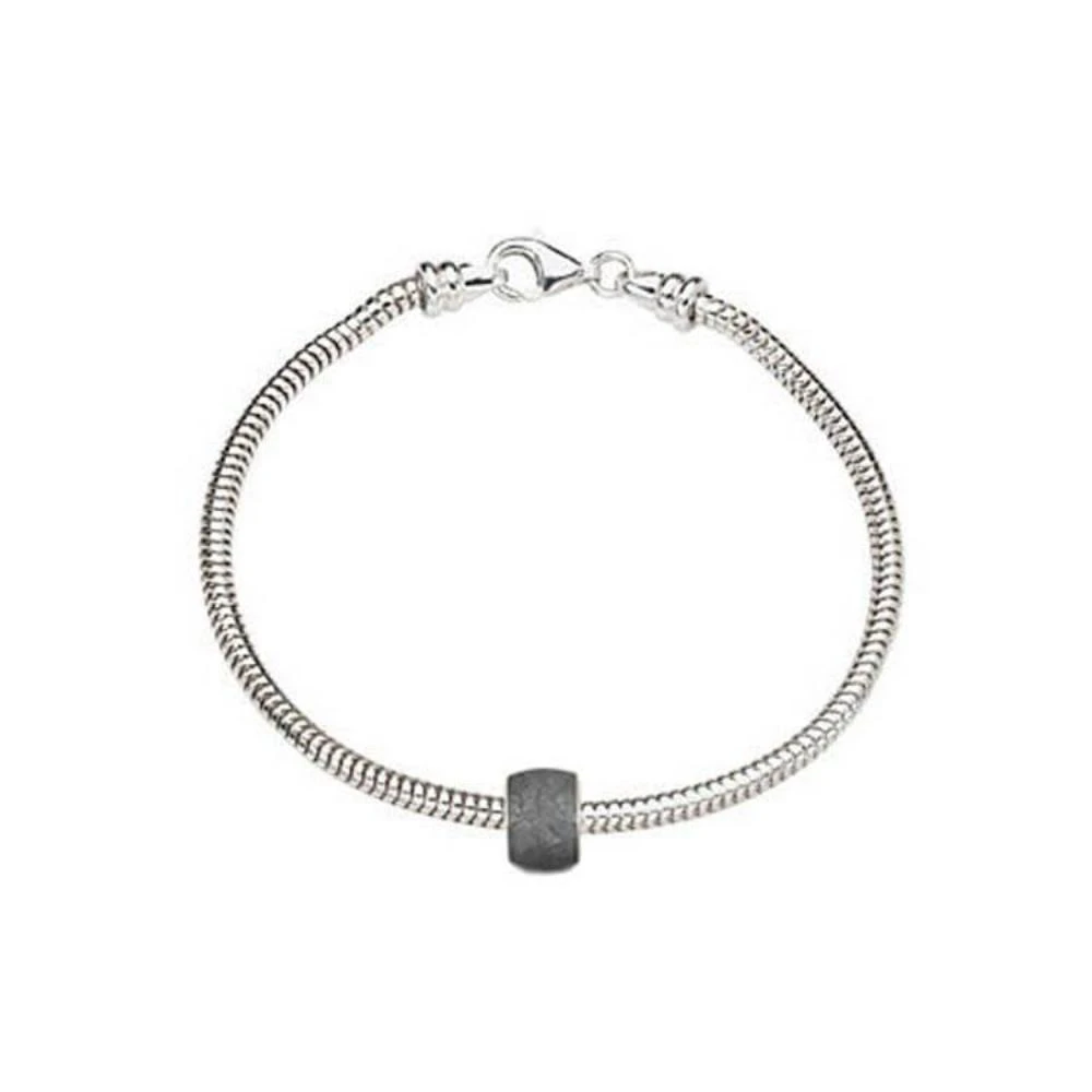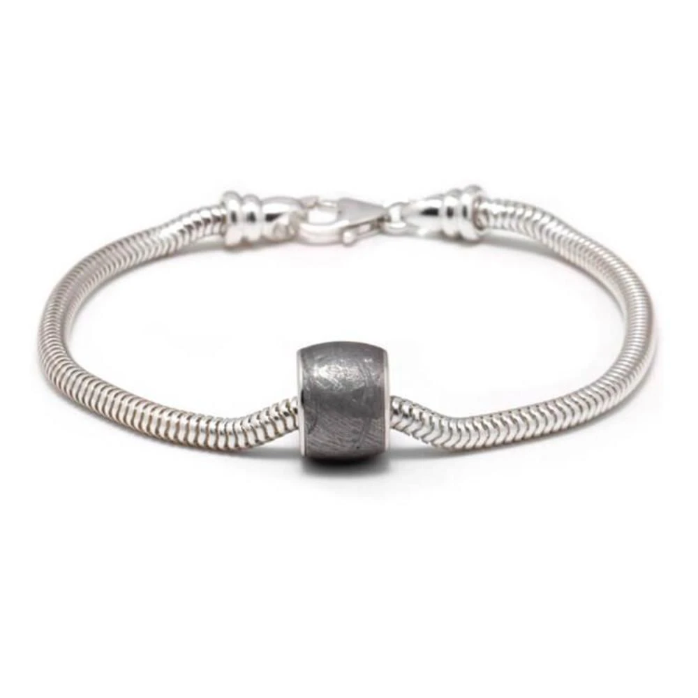 Add a stellar look to your every day attire with this meteorite charm bead bracelet. The sterling silver meteorite bead hangs on a snake bracelet that is available in a variety of sizes. Or, its 5 mm hole diameter makes it compatible with most major bracelet brands.