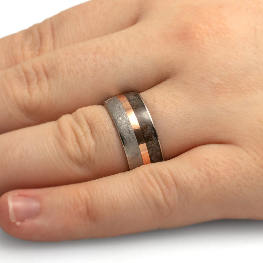 This unique, men’s wedding band features a trio of gorgeous, complementary materials: meteorite, dinosaur bone and a solid rose gold pinstripe.