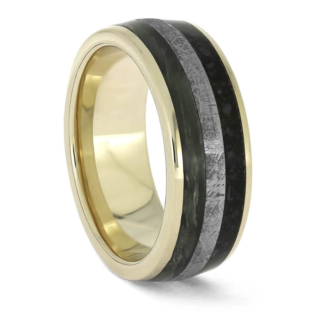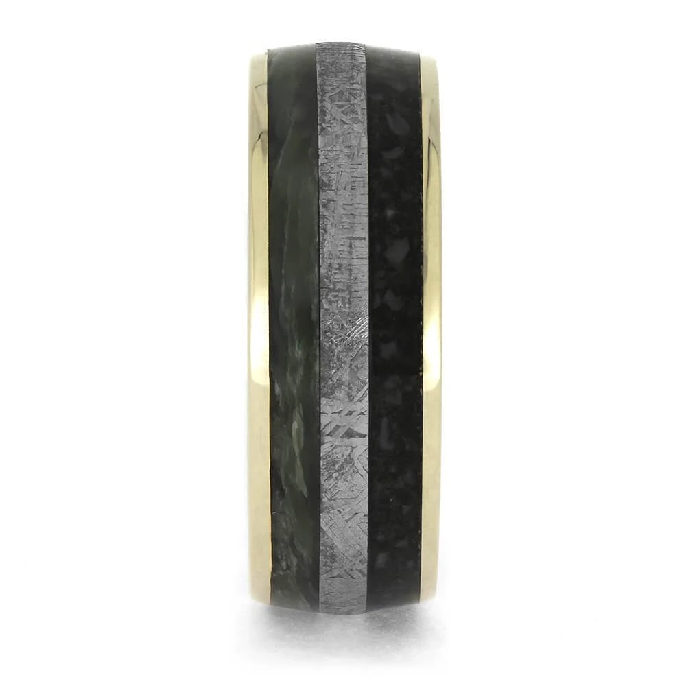 Three rare and exquisite materials come together to form this amazing, handcrafted solid gold ring. Genuine, billion year old Gibeon meteorite is accented by fossilized dinosaur bone and green jade. This meteorite and dinosaur bone ring makes a great men’s and women’s wedding band or statement ring.