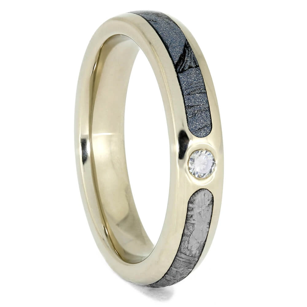 This white gold wedding band has a beautiful moissanite flush set into the band. On either side of the stone is a unique inlay. One side is Gibeon meteorite and the other is coblaltium mokume gane. These materials come together to make a unique engagement ring.
