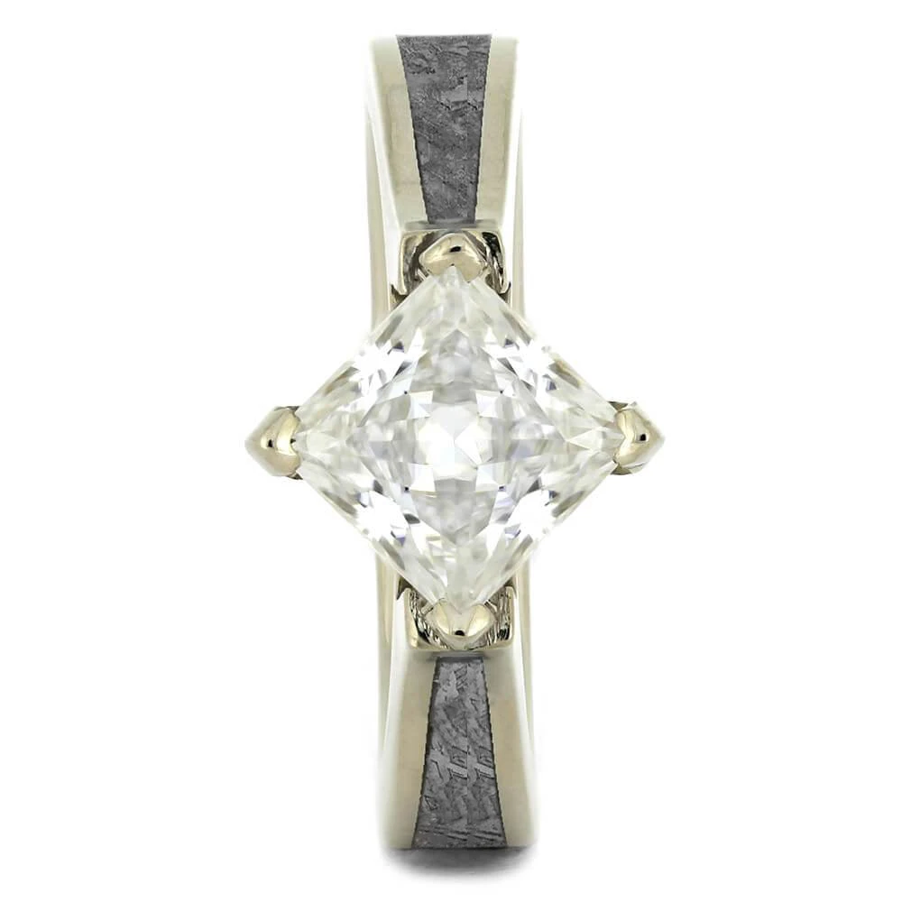 This 14k white gold engagement ring puts a cosmic spin on a conventional solitaire design. The square-cut moissanite is flanked by an inlay of genuine Gibeon meteorite, which travels around the white gold band.