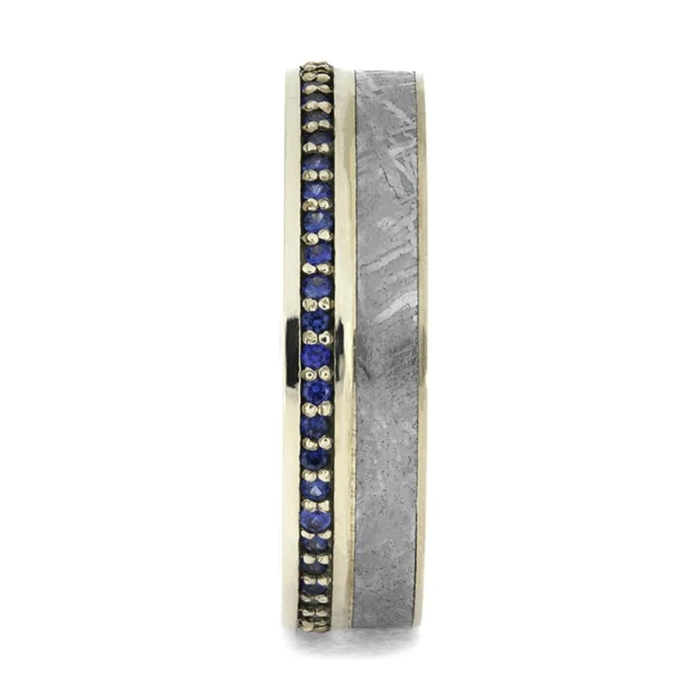 Gibeon meteorite is the star of this unique eternity band. Its endless circle of blue sapphires adds the perfect pop of color and sparkle. Set in solid 14k white gold with a polished finish.