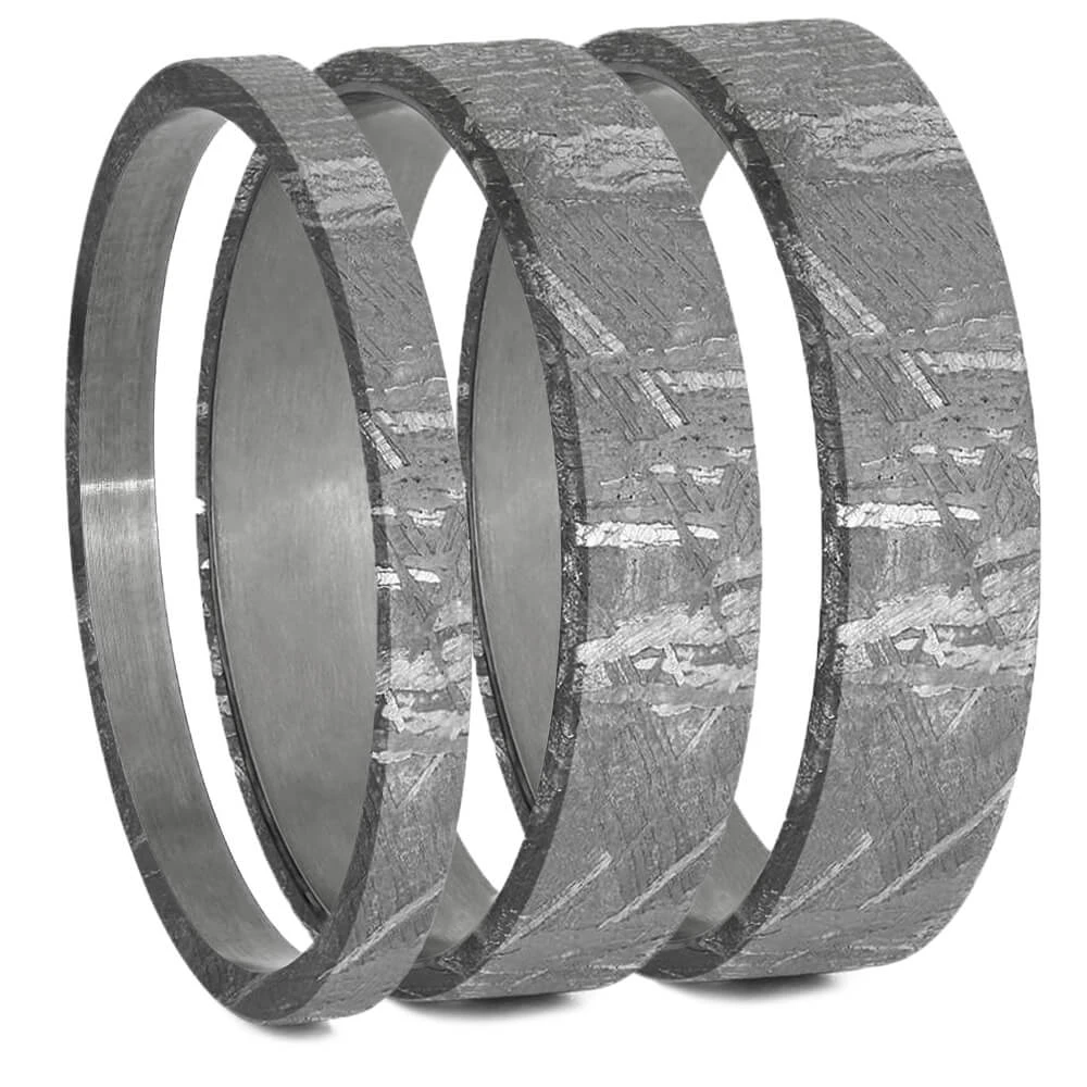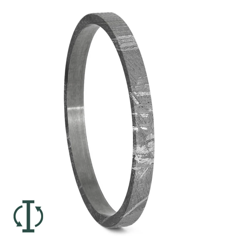 These extraordinary, authentic Gibeon meteorite inlays are designed for our interchangeable titanium ring system only. The meteorite used to make each inlay is etched to reveal its Widmanstatten pattern formed when the meteorite traveled through space before landing on Earth.