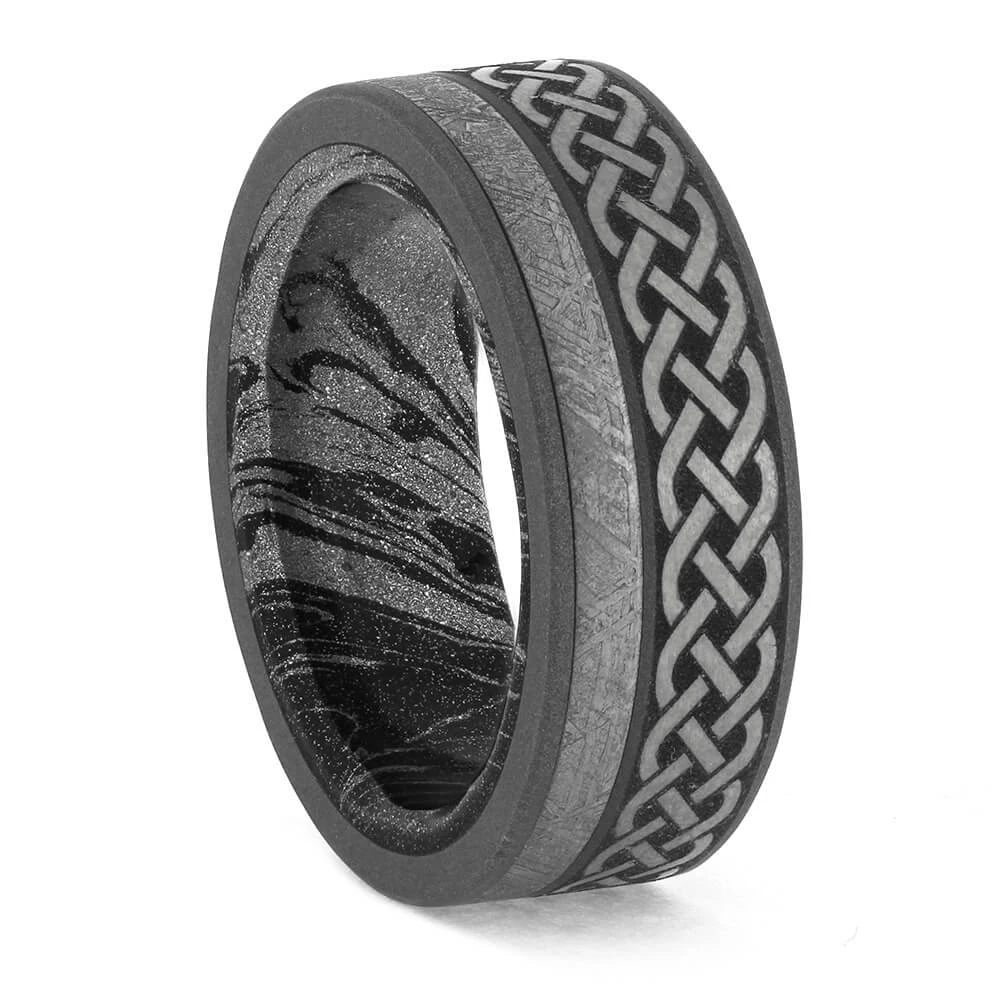 This Celtic wedding band stands out from the rest with the help of genuine Gibeon meteorite. The black and white mokume gane sleeve is both stylish and comfortable.