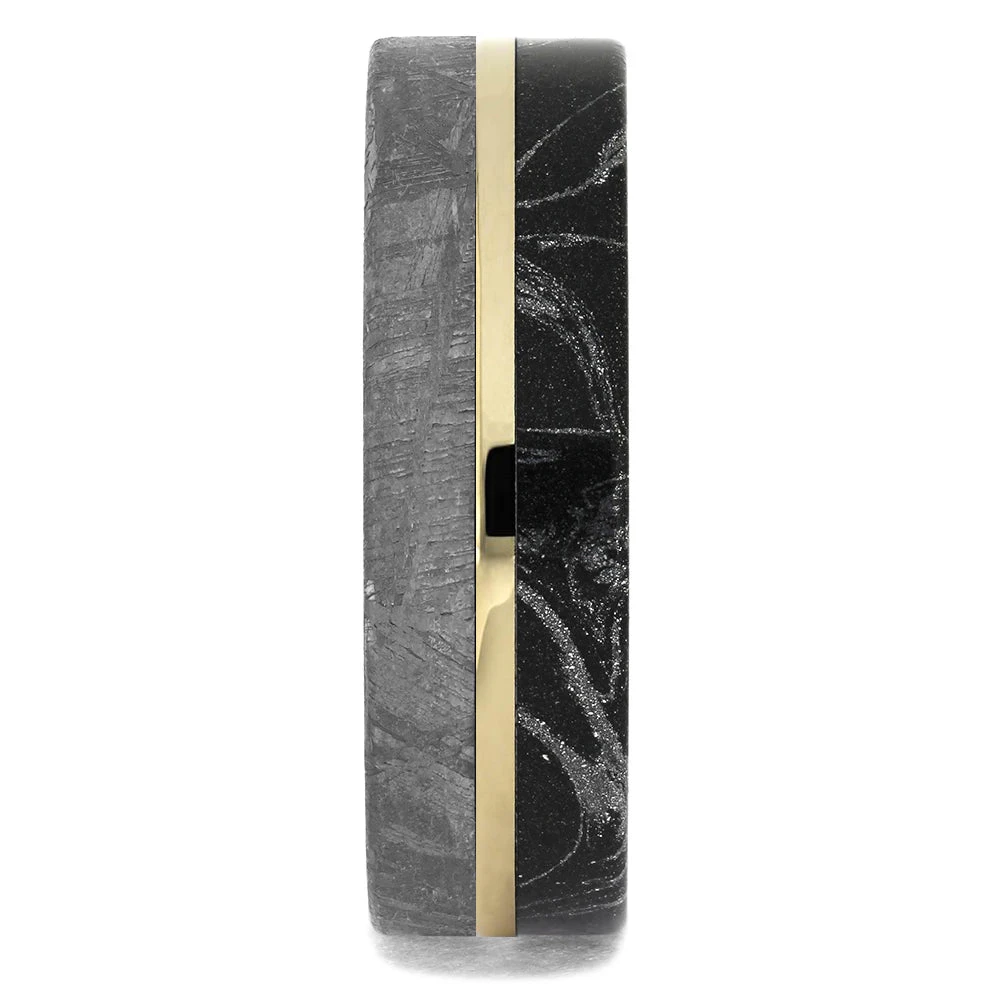 With just one glance this meteorite wedding band has the ability to capture your attention. A swirling black and white composite mokume gane edge complements the Gibeon meteorite on the other side. These uniquely patterned materials are split by a smooth, 14k solid yellow gold pinstripe down the center and held by a comfort fit titanium sleeve.