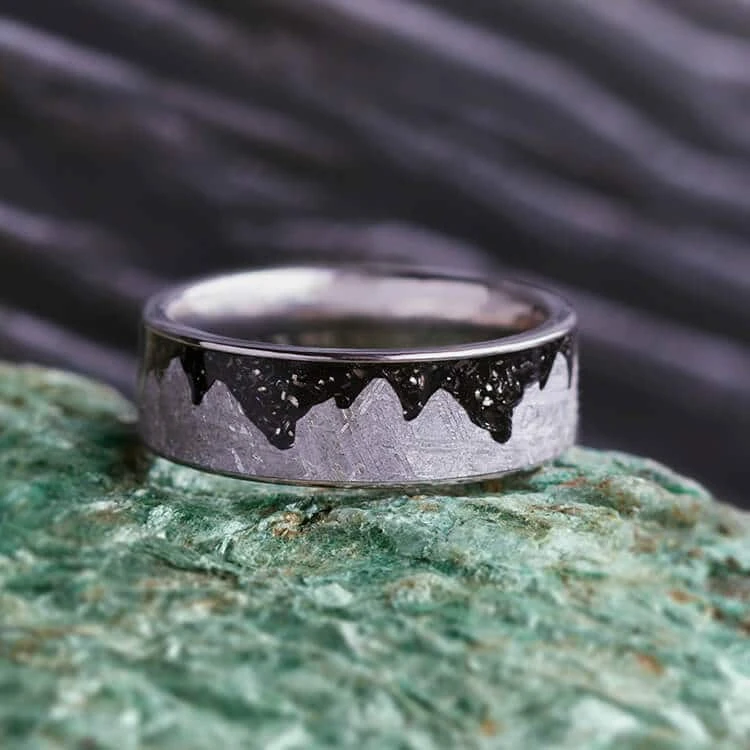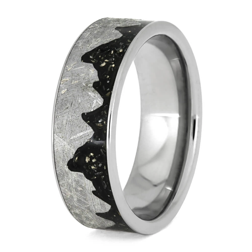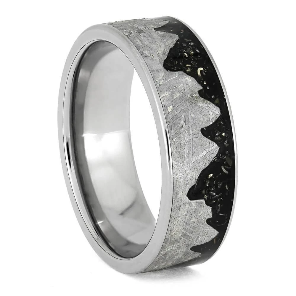 In this unique men’s wedding band, a marvelous moonscape is represented through two amazing materials. Stardust™, which is composed of white gold and meteorite shavings encapsulated in black enamel, creates a sparkling night sky. This perfectly contrasts with the metallic, Gibeon meteorite moonscape. The titanium borders and sleeve provide a lustrous accent to the space materials in the inlay.