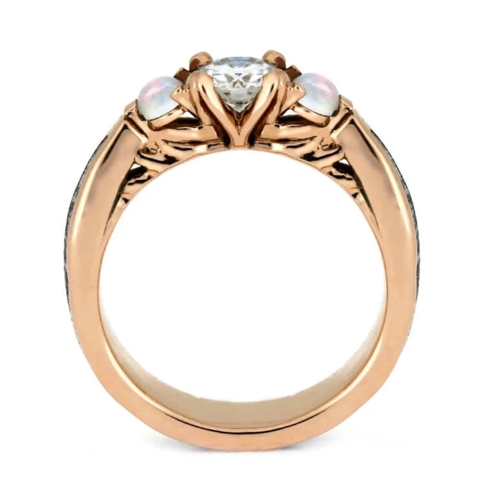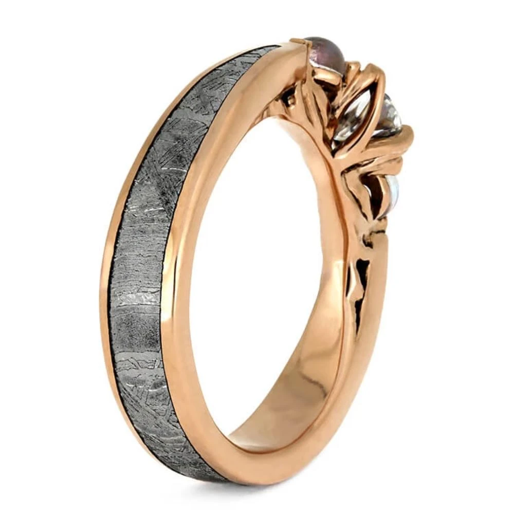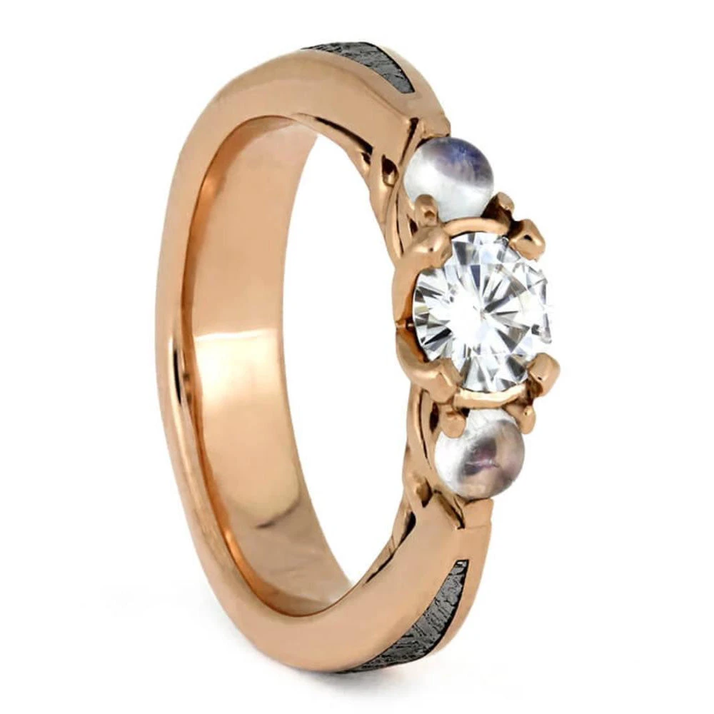 A classic three-stone 14k rose gold design is elevated by the additions of meteorite and moonstones for a truly stellar and unique engagement ring. Flower petal prongs secure the moissanite center stone in place, which is accented by iridescent moonstone cabochons. The reverse-tapered shank is inlaid with Gibeon meteorite to complete the cosmic theme of the engagement ring.