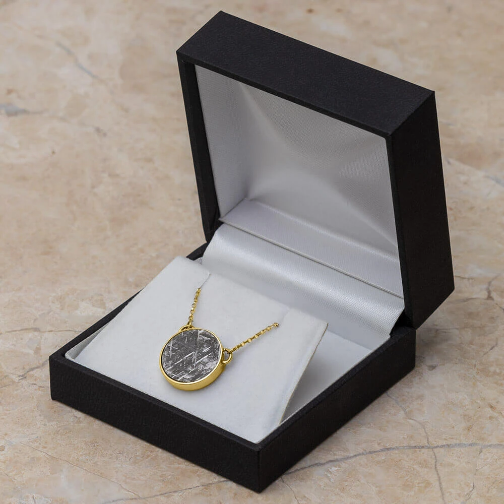 This timeless necklace features a unique element from outer space! The Gibeon meteorite pendant, approximately the size of a dime, is framed by a golden bezel that accentuates the natural etched pattern of the cosmic material. Crafted in polished 14k yellow gold, this exceptional piece brings a luminous and celestial touch to your collection.