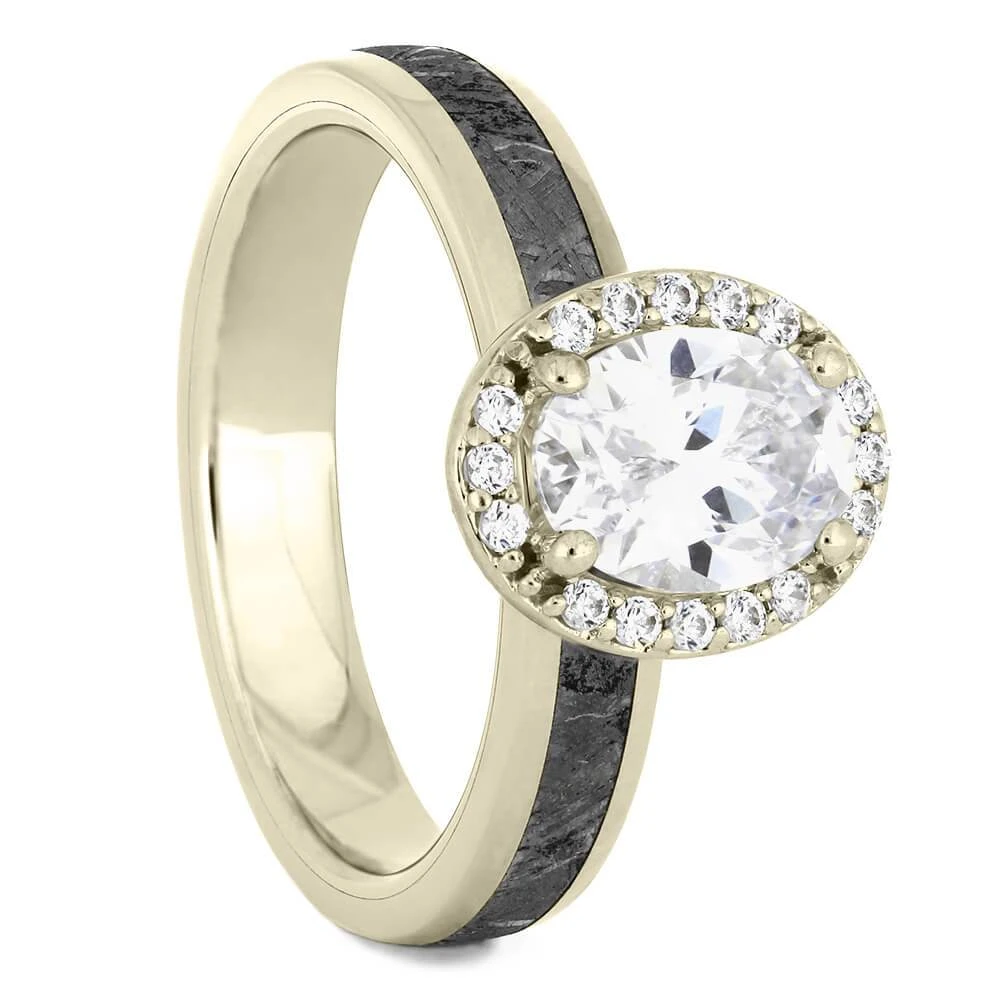 Put a cosmic twist on a traditional design with this oval halo engagement ring featuring an authentic Gibeon meteorite inlay and 14k white gold! A halo of round cut moissanites surrounds a glistening oval cut moissanite for a classic look. This nature-inspired ring is perfect for anyone, but especially astronomers and stargazers!
