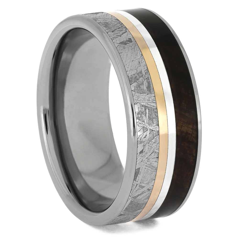 Twin pinstripes of sterling silver and 14k rose gold separate the redwood and meteorite inlays of this handmade, mixed metal wedding band. If you enjoy astronomy or spending time in nature, this is the meteorite ring for you!