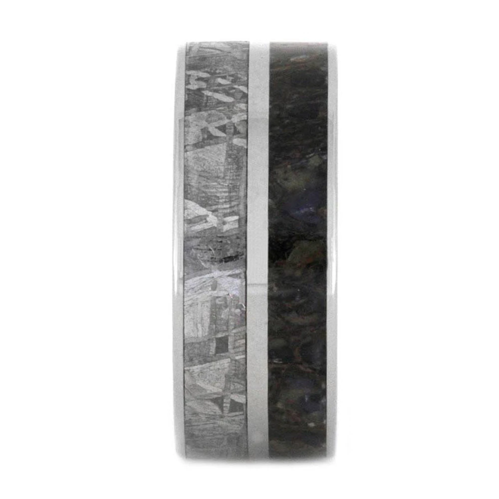 Two eye-catching rarities are inlaid in this meteorite ring. Dinosaur bone and Gibeon meteorite are displaying their exquisite patterns on the outer shell, while a whiskey barrel oak wood lies smoothly on the inside of this ring.