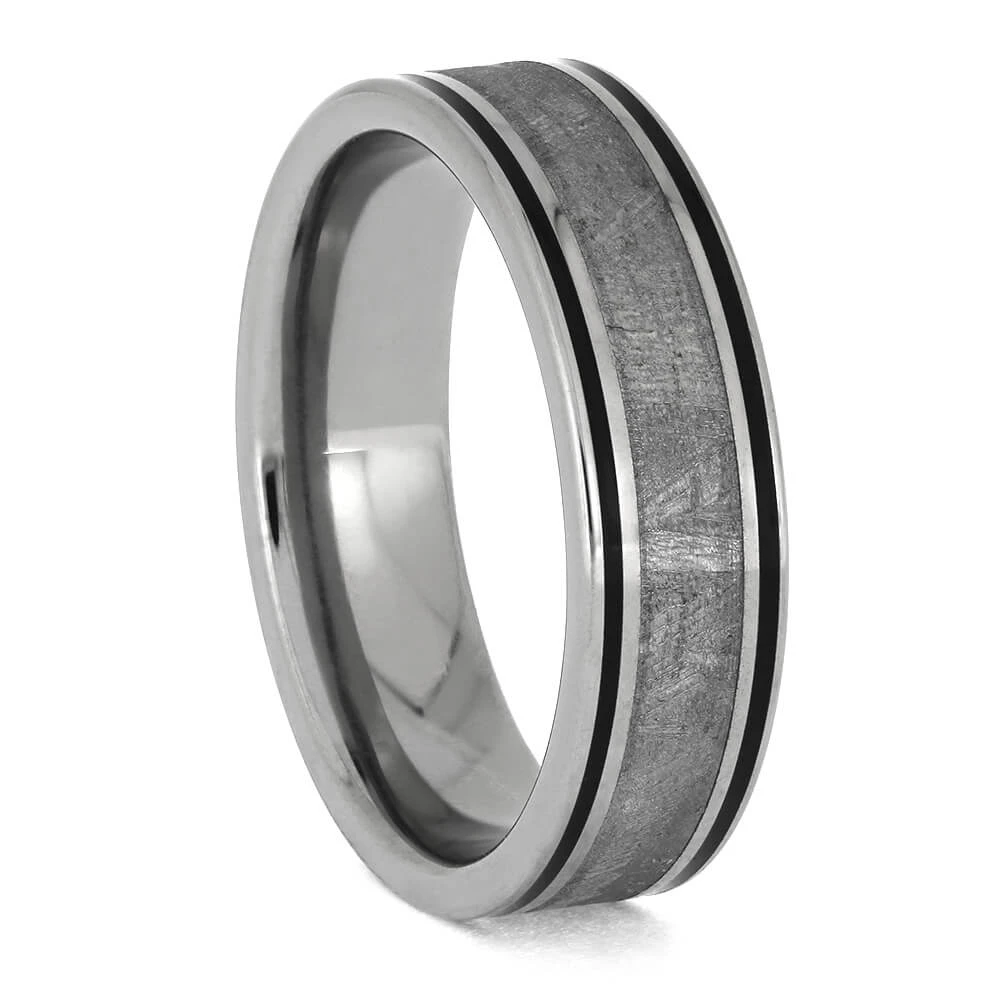 The accents of black enamel on either side of this genuine Gibeon meteorite inlay really make it pop! Featuring the characteristic Widmanstätten pattern of Gibeon meteorite, this wedding band shines with celestial brilliance. Truly, it is a timeless piece.