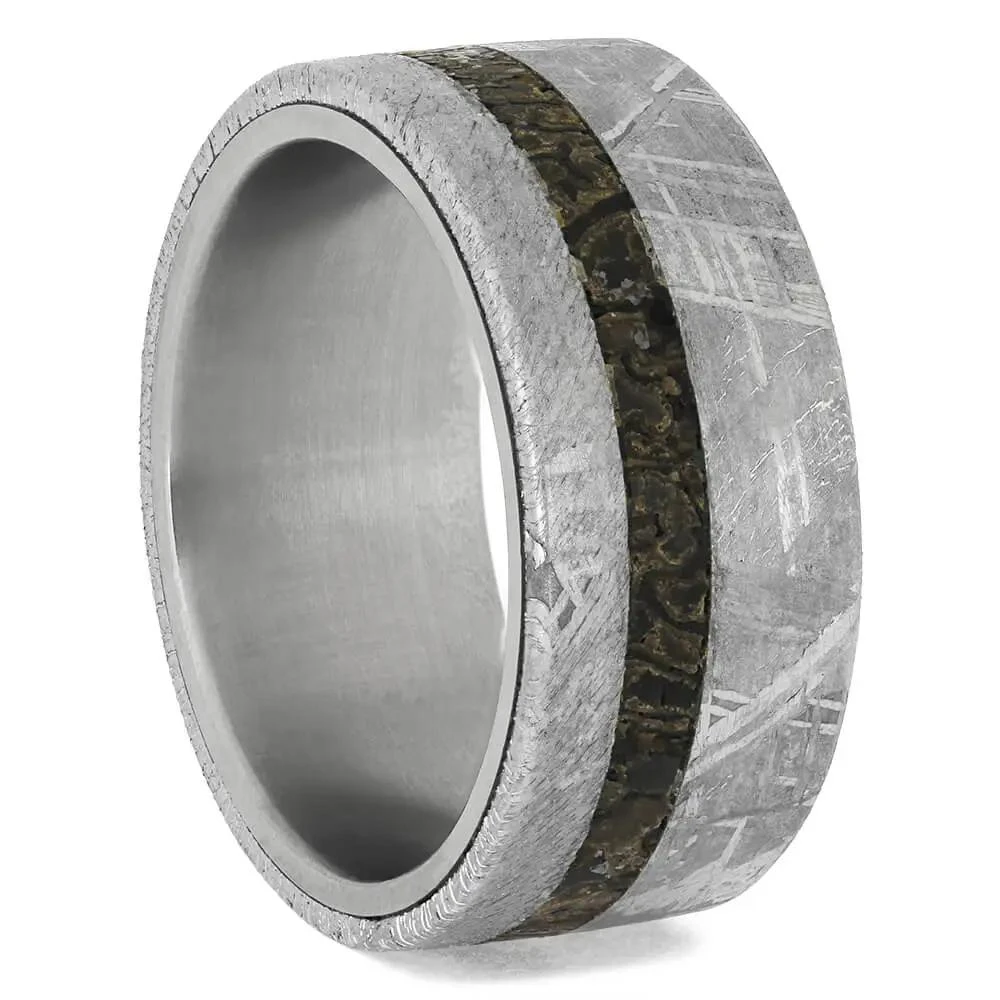 The perfect Gibeon Meteorite ring for him. This fascinating dinosaur bone ring is crafted with real Gibeon Meteorite and has a matte finished titanium sleeve.