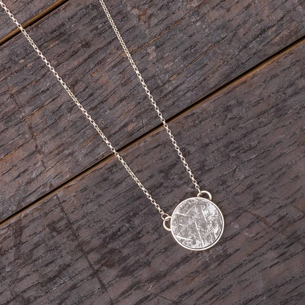 This artisanal meteorite necklace features a dime-sized pendant set in a sleek bezel. The smooth, polished metal on the back creates an ideal surface for personalized engravings. It makes for a unique and thoughtful present for any occasion, from birthdays to special milestones. Wear a real piece of outer space today!