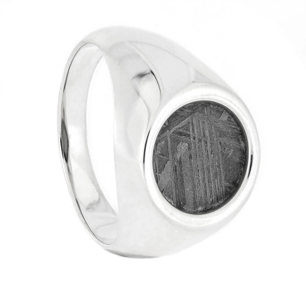 This meteorite ring takes the lovely signet ring design and revolutionizes it with a Gibeon meteorite center. The lovely meteorite pattern sits front and center within the silver band.