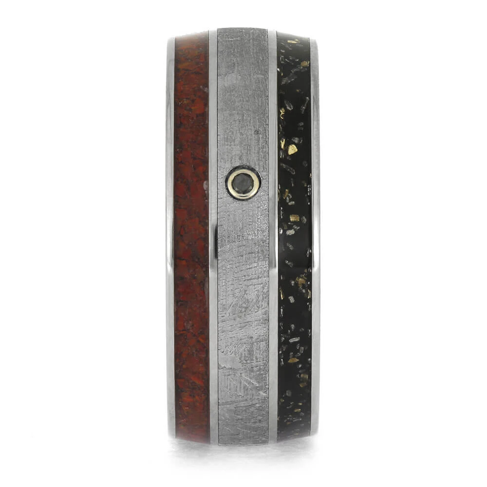 This men’s wedding band showcases a captivating meteorite core flanked by black stardust and red synthetic opal accents. Set within a sturdy titanium band, the combination of these materials creates a distinctive alternative to traditional wedding rings.
