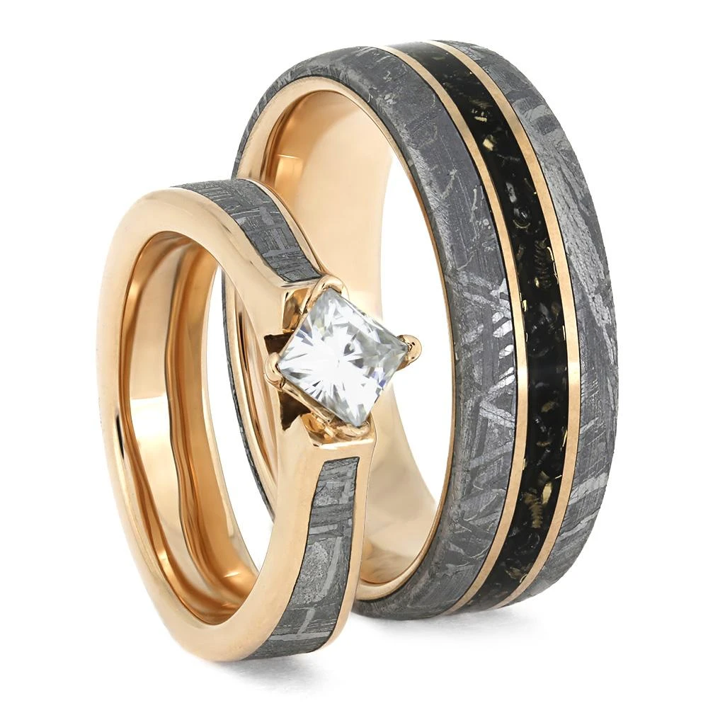 Show off your unique style with this 14k rose gold meteorite ring set featuring our Stardust material and ancient Gibeon meteorite. Each of these matching 14k rose gold rings has a legacy that will stand the test of time. These handmade wedding rings are perfect for a couple who enjoys astronomy, studying space, or sharing romantic evenings staring at the stars!