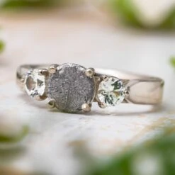 Make a one-of-a-kind statement with this meteorite stone ring with sapphire accents! This alternative engagement ring is crafted from genuine, Gibeon meteorite, elevated with sparkling sapphire accents, and set in 14k gold, it’s sure to be a show-stopping piece for your special someone. Own your own piece of the sky today!
