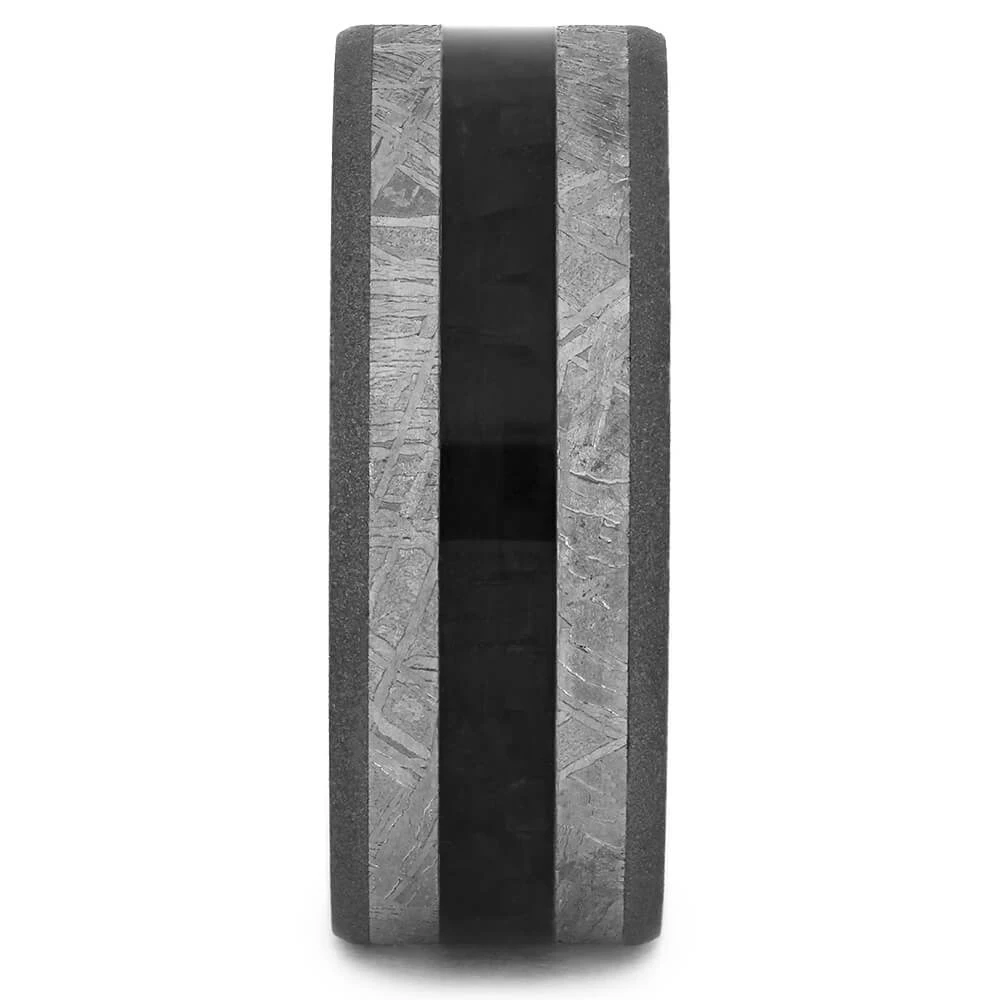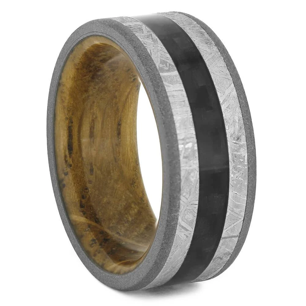 Black carbon fiber cuts down the middle of this authentic meteorite wedding band. The sleeve of this unique ring has whiskey barrel wood, feeling comfortable against the skin.