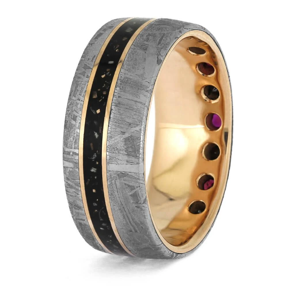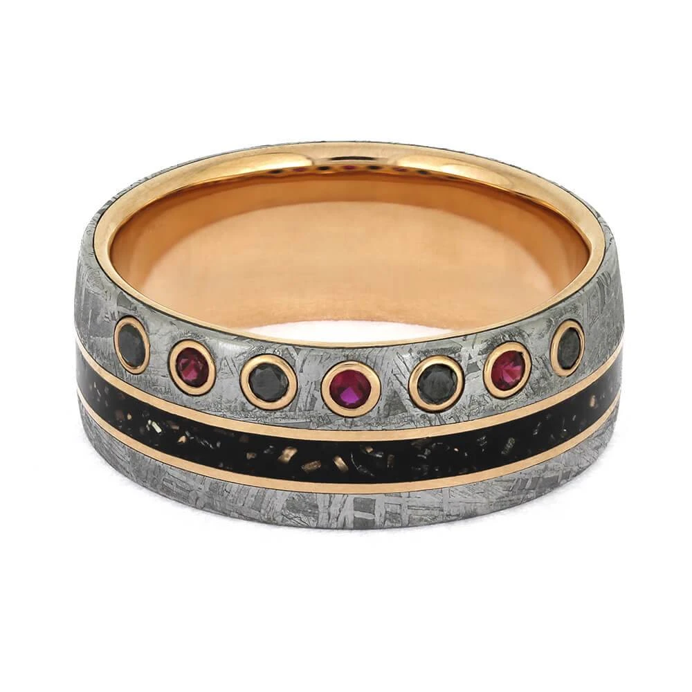 Capture the beauty of the night sky with this exquisite meteorite wedding band. The perfect combination of rubies, black diamonds, and Stardust™ sparkle against the black and red meteorite, giving off an elevated, sophisticated feel. The Gibeon meteorite edges make this ring an excellent choice for astronomy enthusiasts!