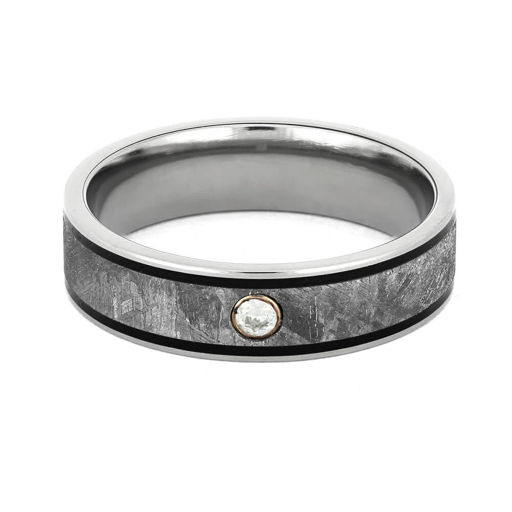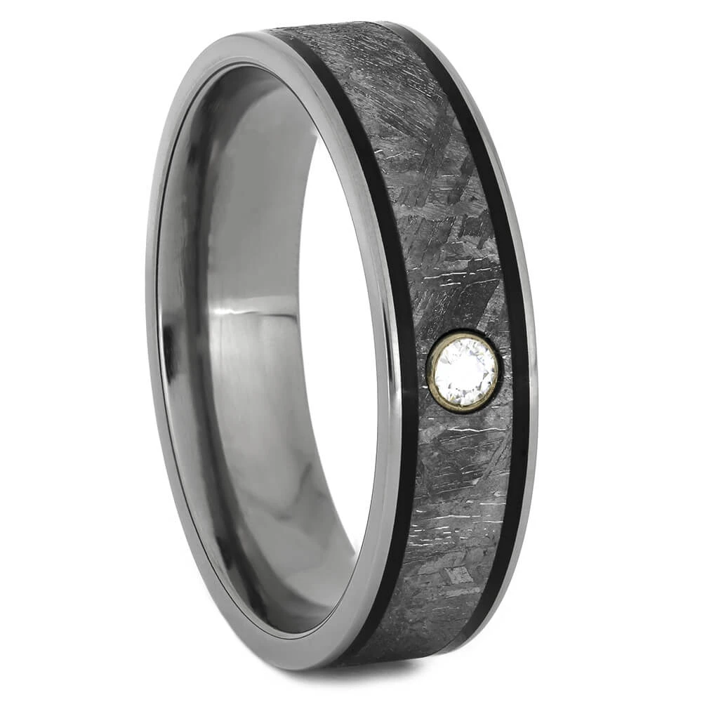 Show off one of Earth’s rarest materials with this meteorite wedding ring for men. This titanium ring features a glistening moissanite gemstone set in a white gold bezel, which is flanked by two decorative black pinstripes. This meteorite wedding band is ideal for astronomers and space enthusiasts!