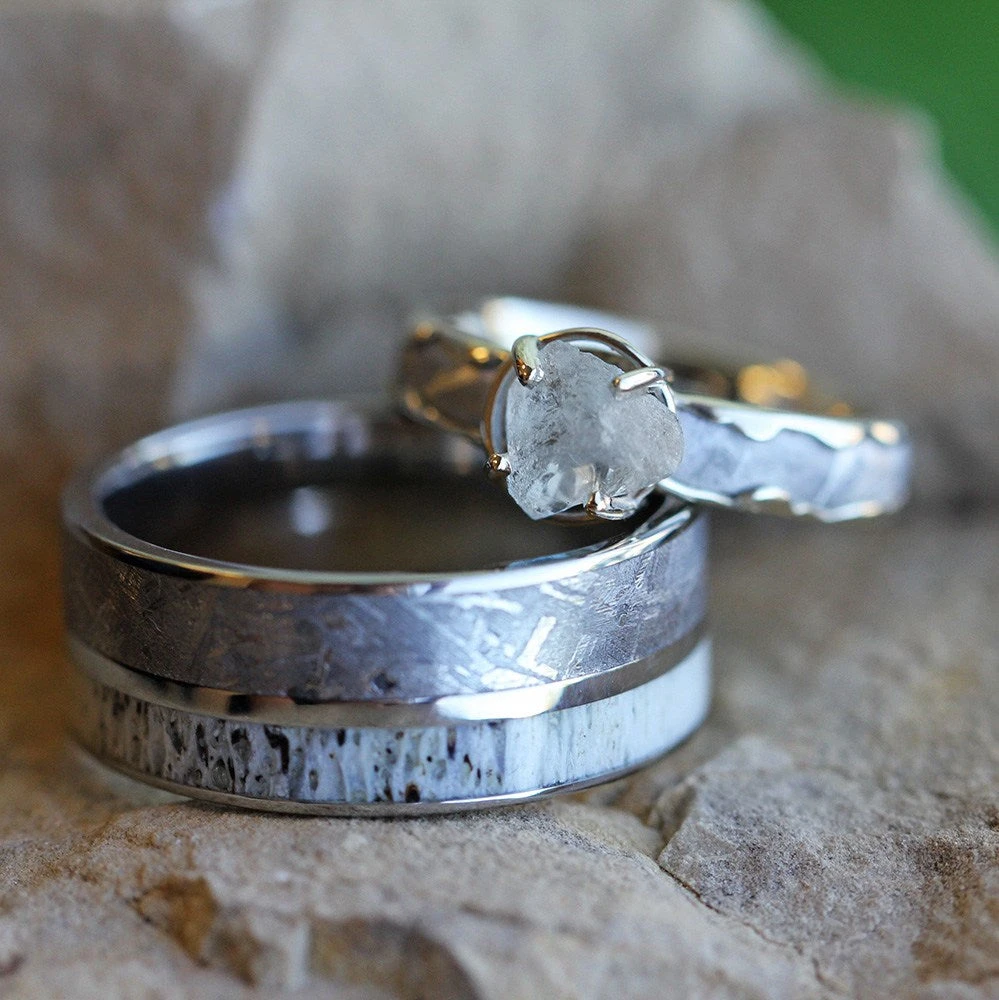 This meteorite wedding ring set includes a women’s rough diamond engagement ring paired with a deer antler wedding band for men. Both of these rings display a Gibeon meteorite inlay for a unique look. The engagement ring is 10k white gold with a wavy design, while the wedding band is made with titanium and has a smooth polished finish.