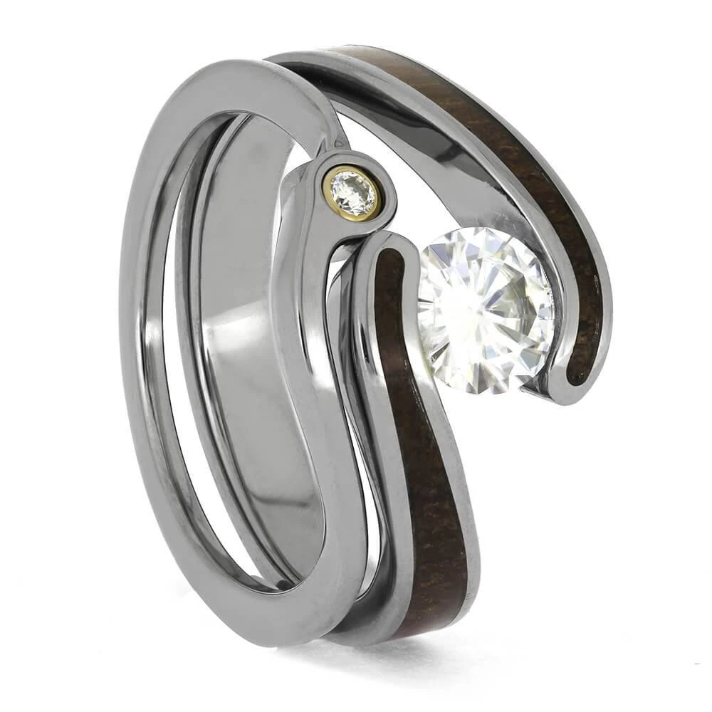 This stylish ring set is made of titanium and Koa wood, with a tension-set moissanite in the center and a shadow band. The titanium is light and robust, while the Koa wood is durable and elegant. The moissanite provides an extra sparkle that enhances the overall design. Perfect for that special day!