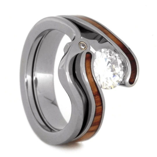 Wow your bride to be with this elegantly designed women’s wood wedding ring set. Her eyes will shine with joy when she gazes upon this stunning tension set moissanite engagement ring. The sleek titanium band is inlaid with wonderful tulipwood, a natural element adding one of a kind appeal to the set. A dainty wedding band with a subtle diamond set in white gold fits perfectly aside its counterpart.