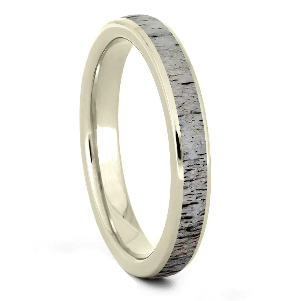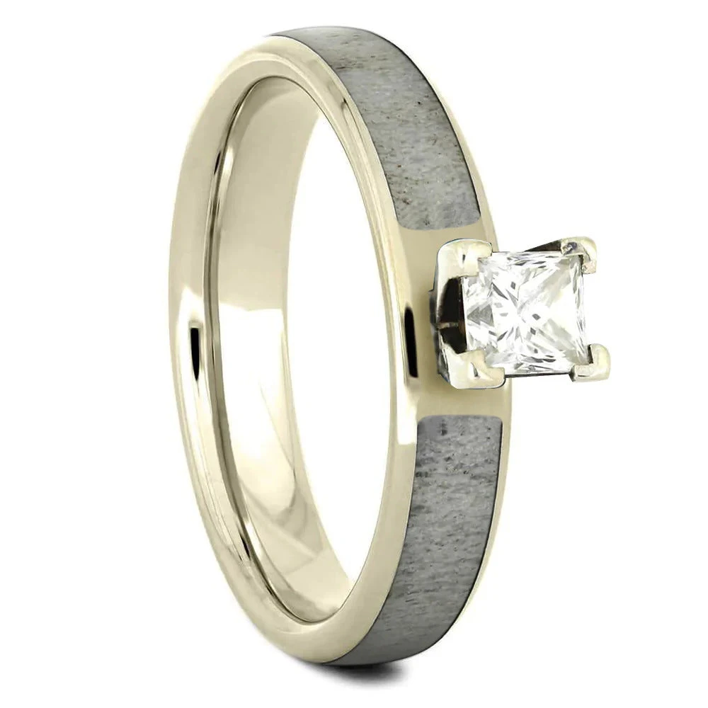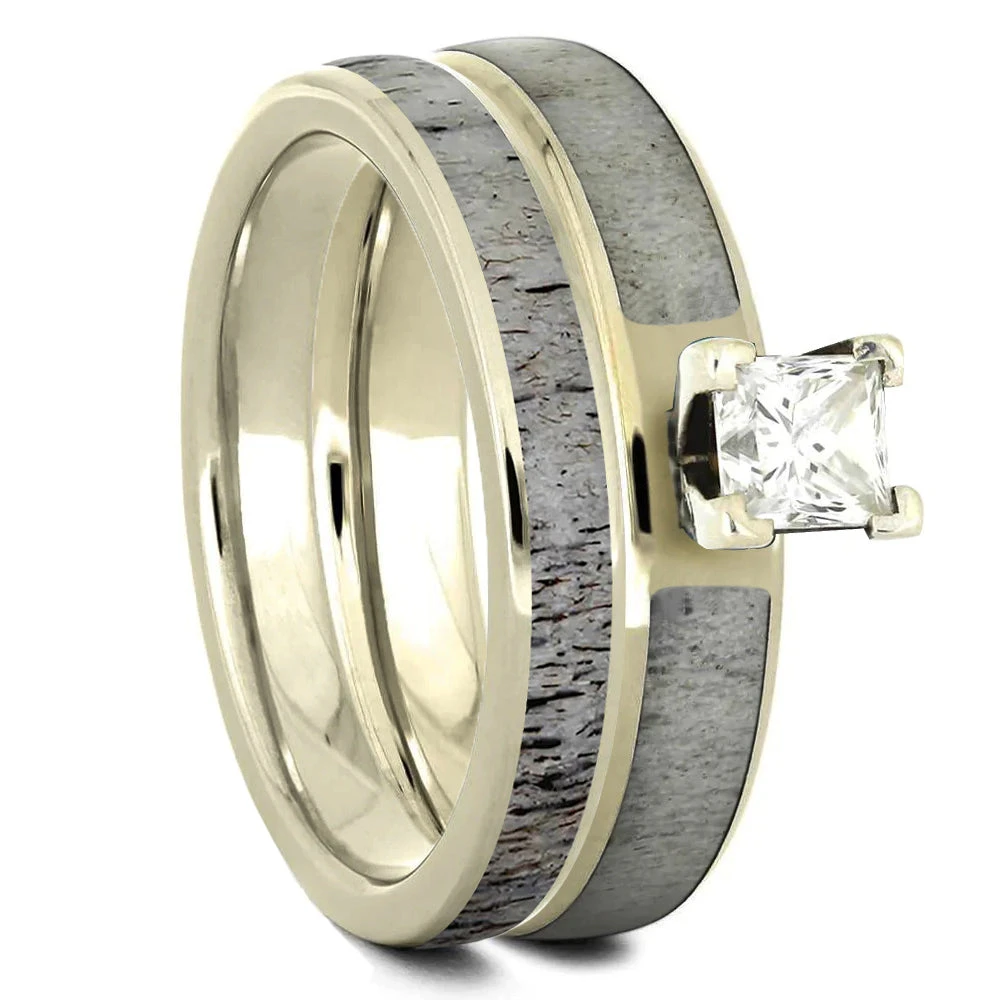 This wonderful moissanite bridal ring set is how hunters say “I do.” The solitaire engagement ring and wedding band are both inlaid with matching naturally shed deer antler.