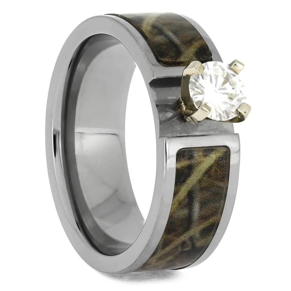 She won’t be able to take her eyes off of this camo engagement ring. A stunning moissanite sits in a white gold peg setting. Pop the question with this camo and titanium engagement ring and pleasantly surprise her!