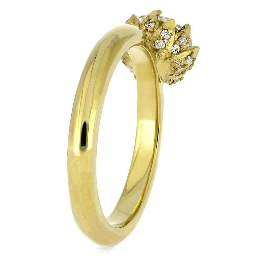 She is sure to love the romantic feel of this gorgeous 14k yellow gold engagement ring. A moissanite is surrounded by even more moissanites in a blossoming lotus setting.
