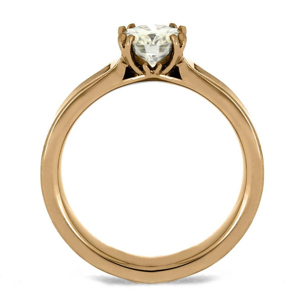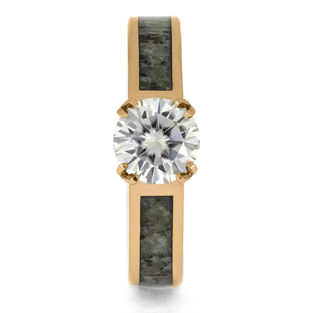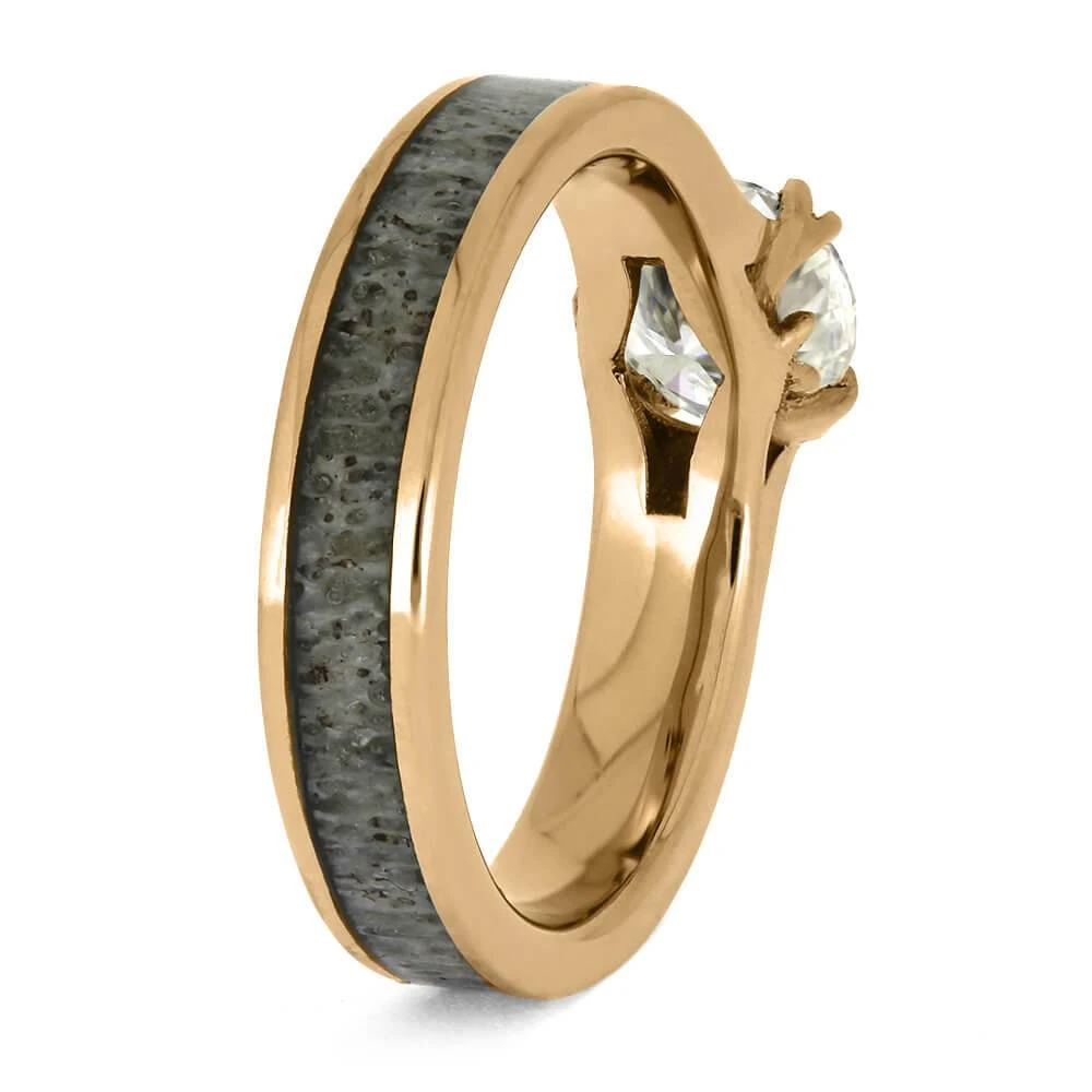 This unique Moissanite engagement ring is perfect for women who love hunting or nature. It features a custom design with a moissanite gemstone, held in place by antler prongs. The 14k rose gold band is inlaid with naturally shed antler, giving it a one-of-a-kind look.