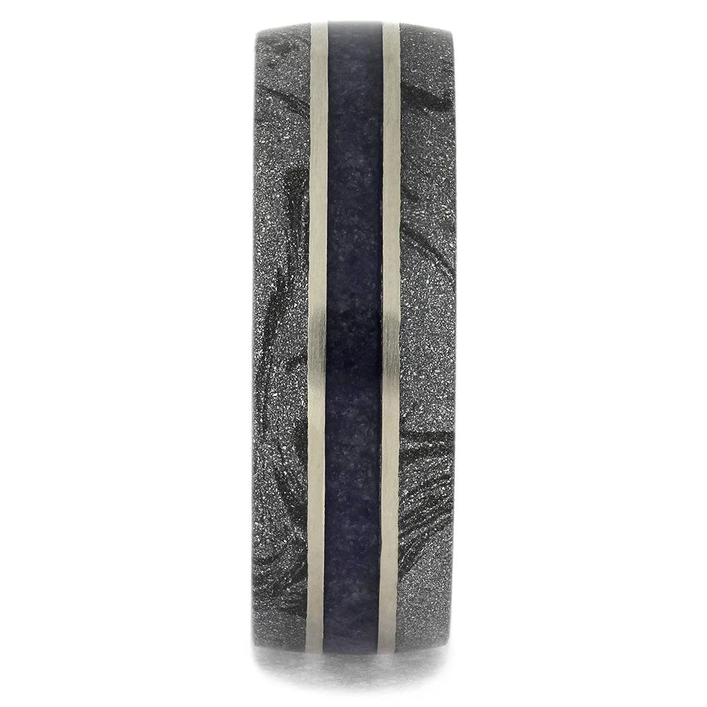 Mixed metals and crushed blue sapphires decorate this men’s wedding band for a unique, sophisticated look. This band is accented by twin white gold pinstripes and cobaltium mokume gane edges.