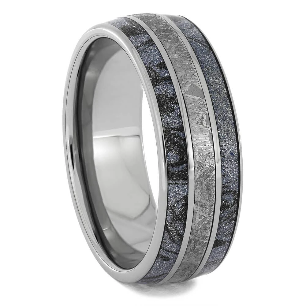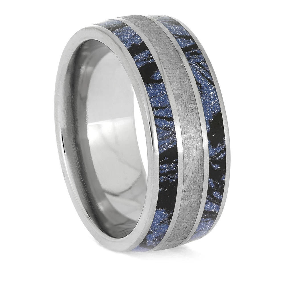 This terrific wedding band has a mysterious look with its mesmerizing meteorite inlaid between two fantastic, cobaltium mokume gane edges. The swirling composite mokume makes it hard to look away.