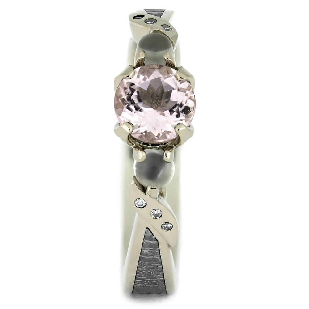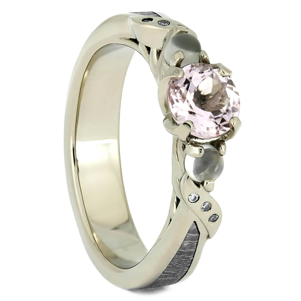 Floral prongs secure the morganite center stone in place, which is accented by two iridescent moonstones. The reverse-tapered shank is inlaid with Gibeon meteorite and decorated with six sparkling moissanites. This space ring is ideal for astronomers and stargazers!