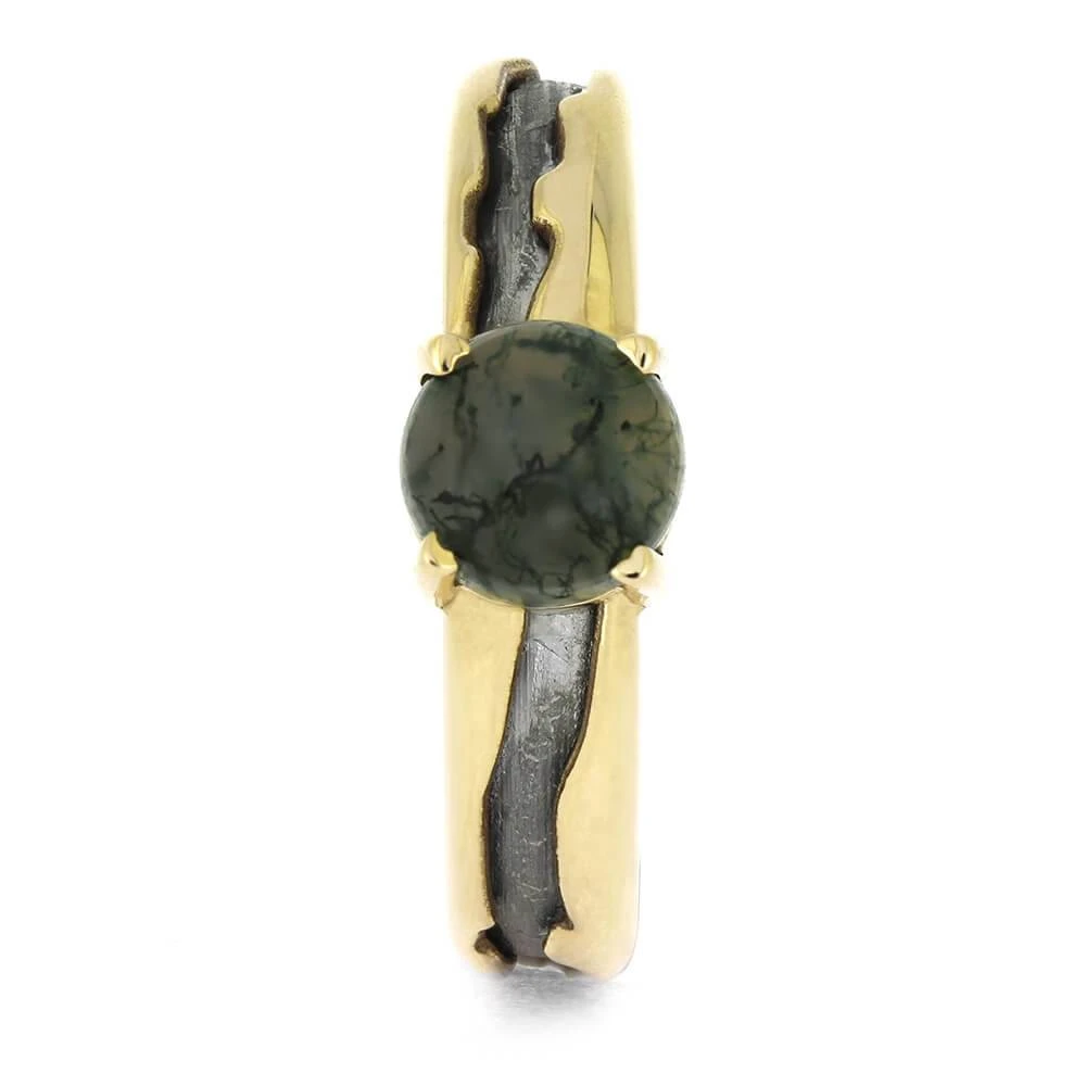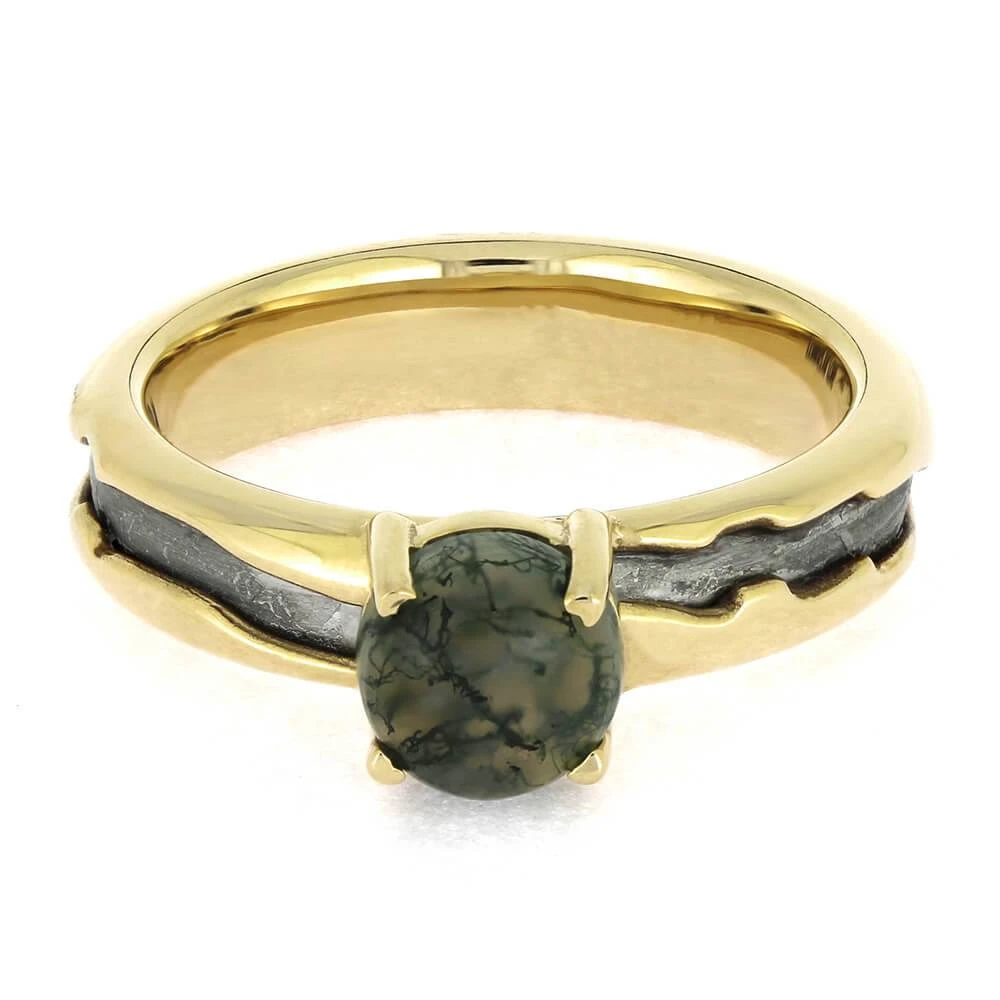 The moss agate engagement ring offers a one-of-a-kind option for those seeking a vibrant and unconventional piece. The combination of a wavy profile with angular meteorite inlay creates a nature-inspired, distinct design. This engagement ring is crafted in the USA!