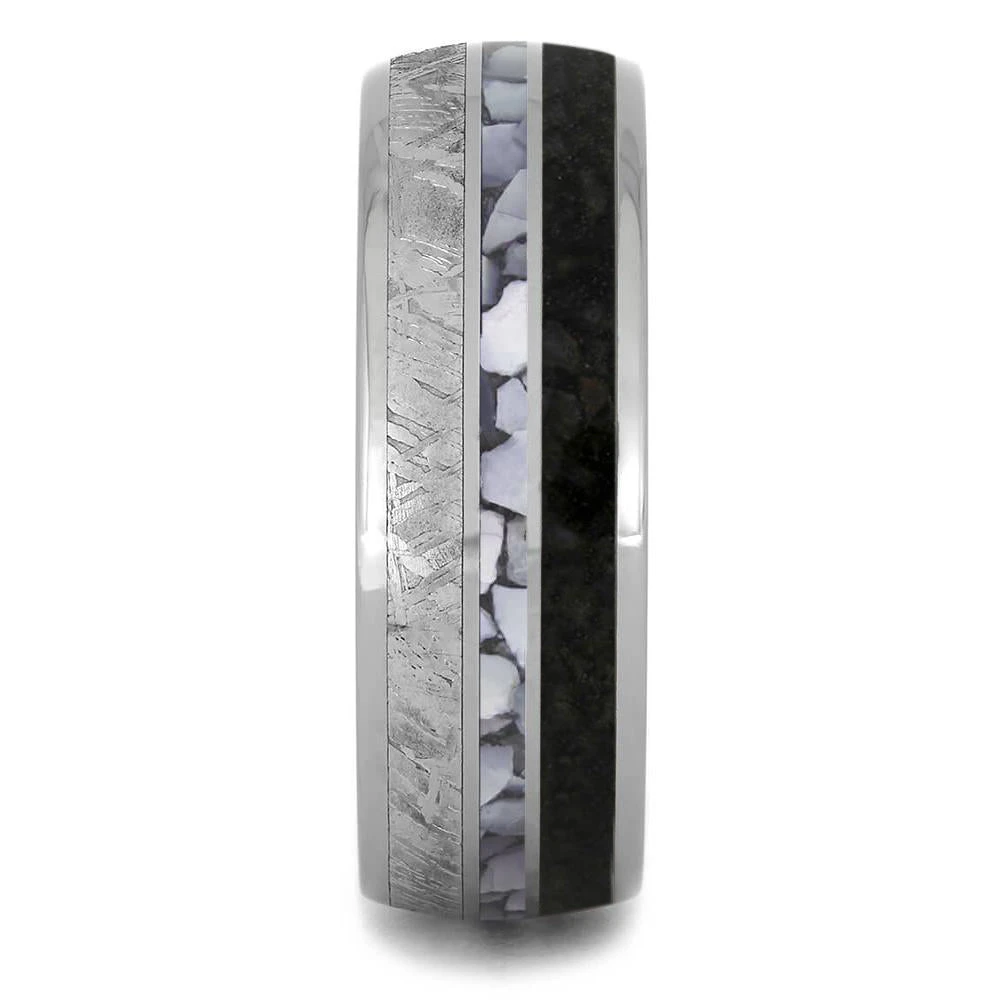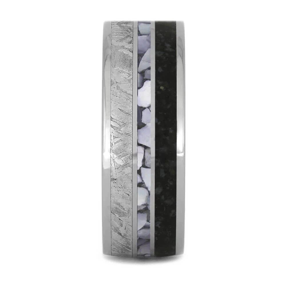 Pearls are just not for women, now even men can wear them. This mother of pearl wedding band is the perfect representation of your commitment. All three materials inlaid in this ring have been around many years ago, just like your everlasting love. Meteorite, dinosaur bone, and mother of pearl together in this titanium band makes this a truly wonderful piece.
