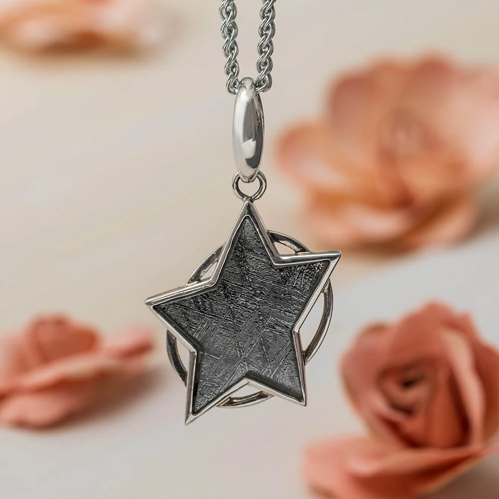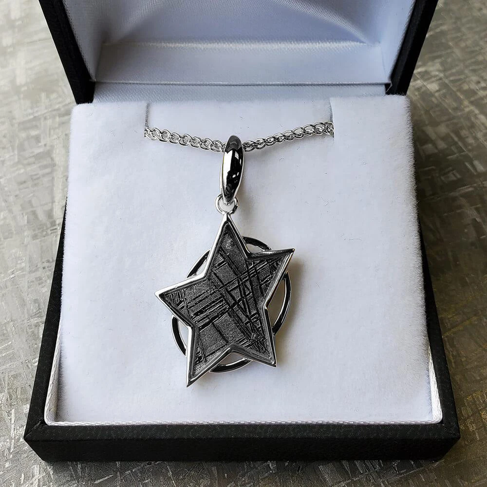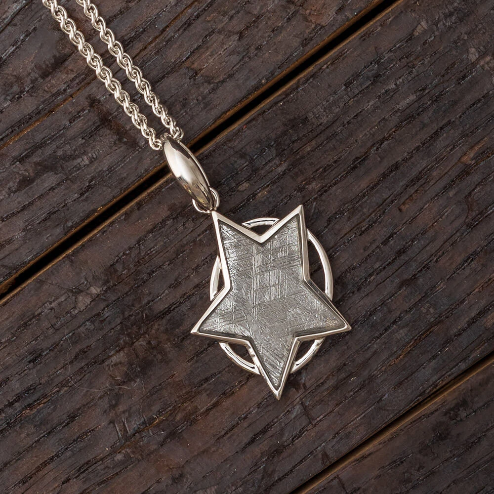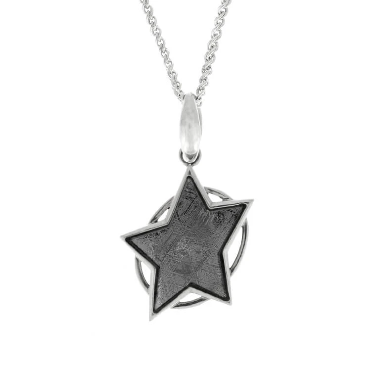 Our 18″ meteorite star necklace (SKU RSSB228) is also available; it is a smaller version of this pendant on a shorter chain.