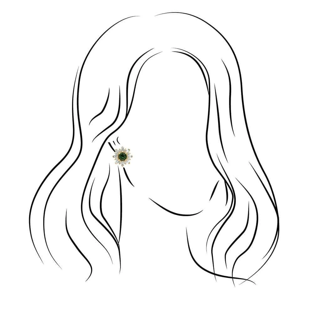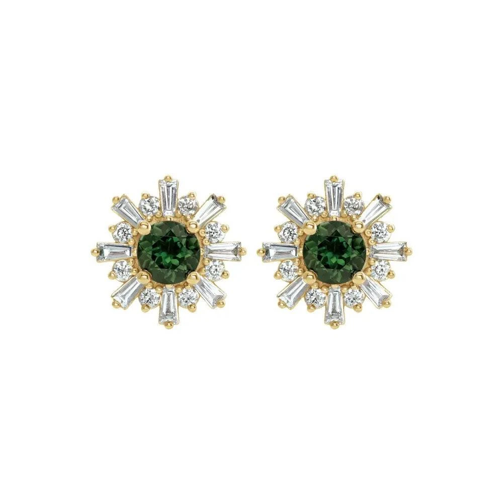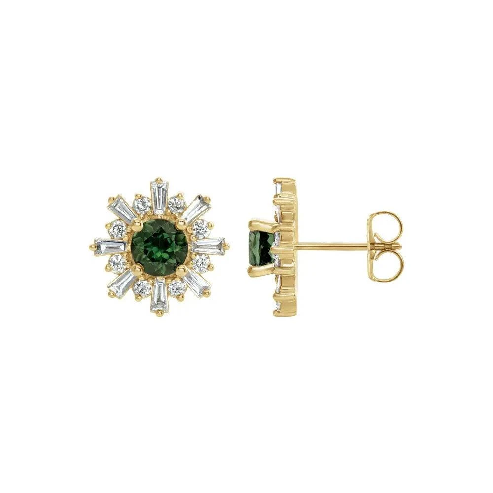 Stunning is an understatement when describing these unique diamond and green tourmaline earrings. Bursting with beauty, these stud earrings resemble a flower with their combination of round and baguette cut stones. Crafted in perfectly polished 14k yellow gold.