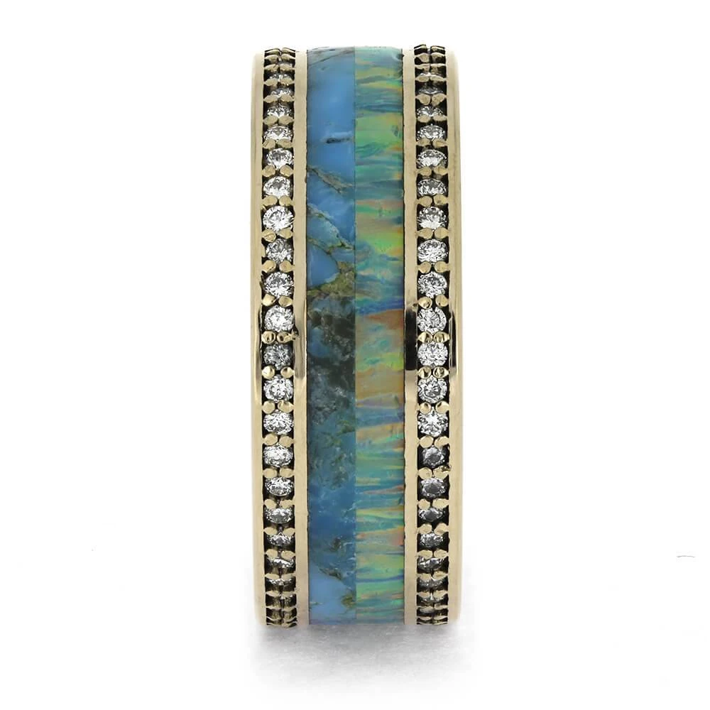 This 14k white gold wedding band features synthetic opal and Kingman blue turquoise, accented by two diamond eternity bands filled with natural diamonds. Perfect for weddings or anniversaries, it symbolizes timeless love. Customize this design or shop our other eternity bands for unique and sophisticated styles!