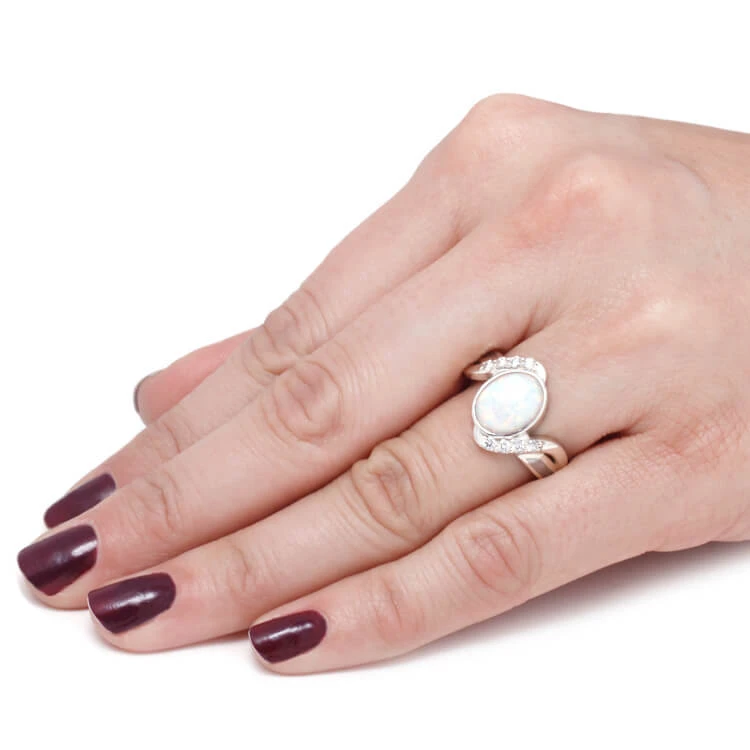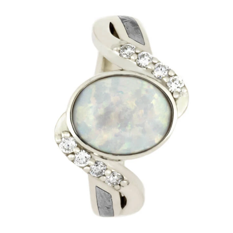 Show her how much she means to you with this opal engagement ring. This meteorite ring is decorated with four dazzling diamonds on each side of the twisted shank. The main gemstone is a lab created white opal that sits on a full bezel setting. This unique engagement ring is made of 14k white gold.