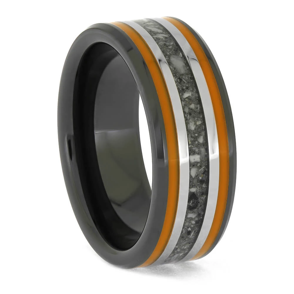 Crafted from durable black ceramic, this personalized ring honors the memory of a beloved pet, companion, or dear friend. It boasts three unique inlays, each framed by sleek titanium pinstripes, while fiery orange enamel adorns the outer portions and a special compartment in the center holds ashes or cremains.