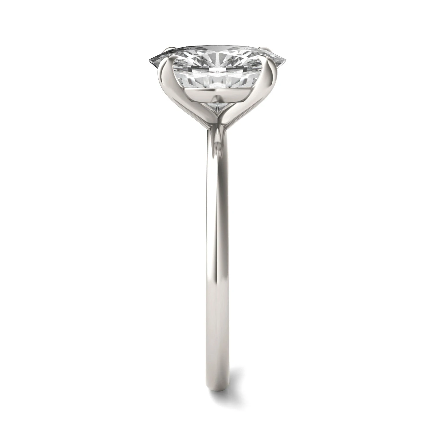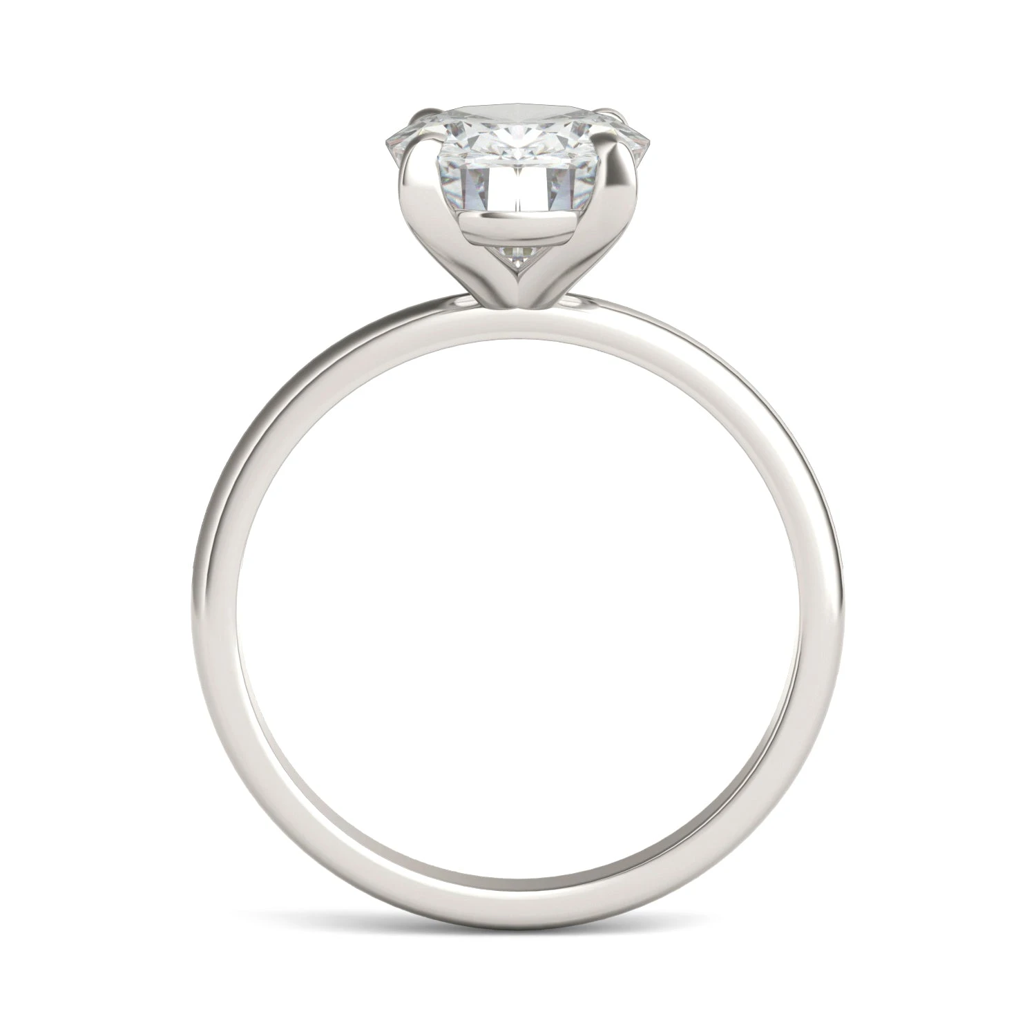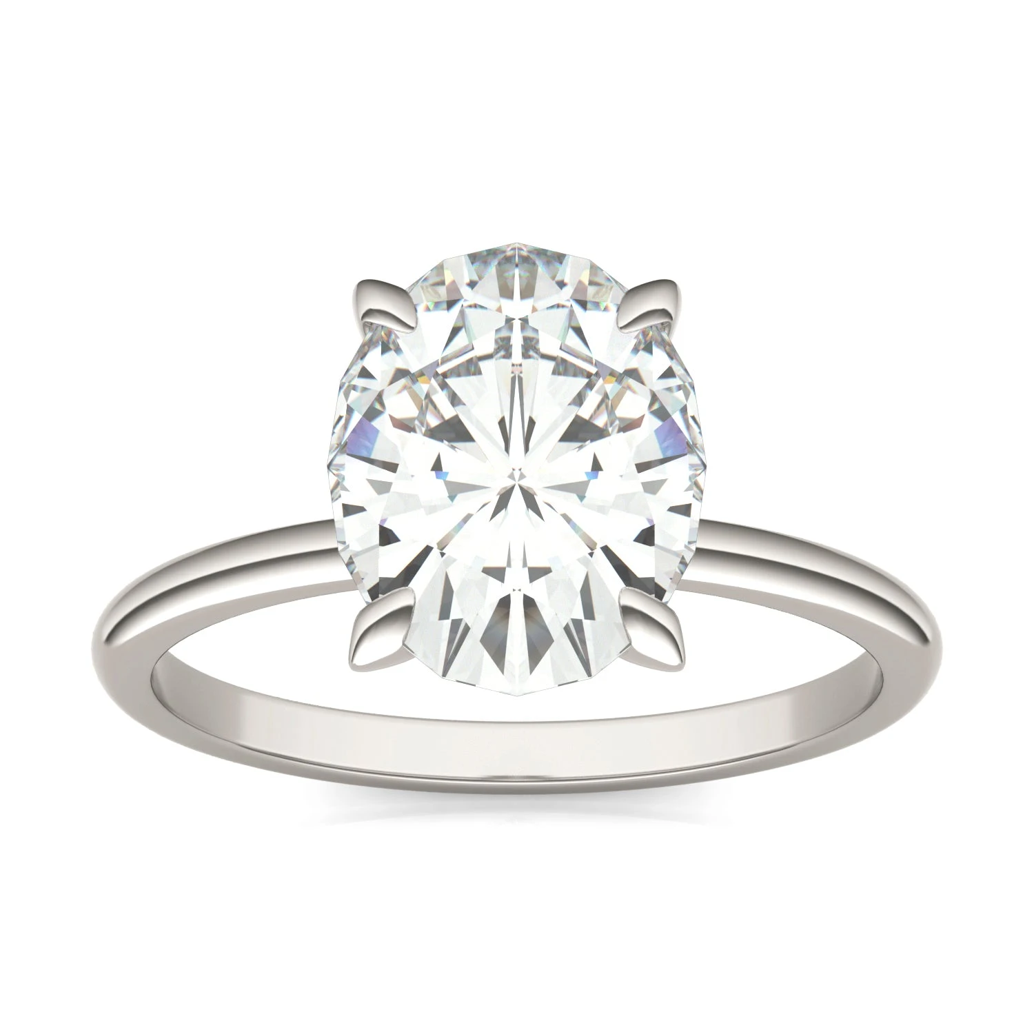 This white gold ring features a 2.5 ct oval shaped moissanite center stone. This large moissanite by Charles & Colvard steals the show and is something she will be proud to wear.