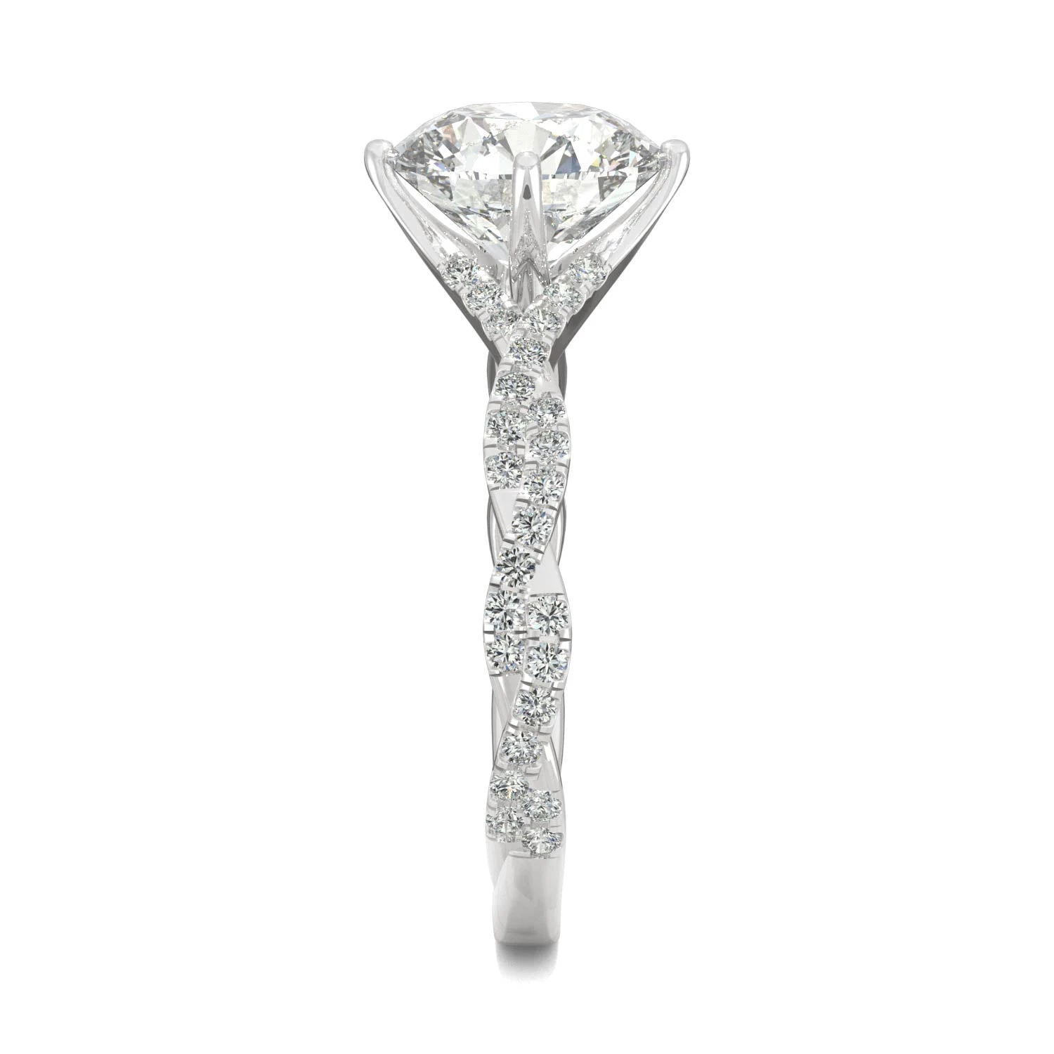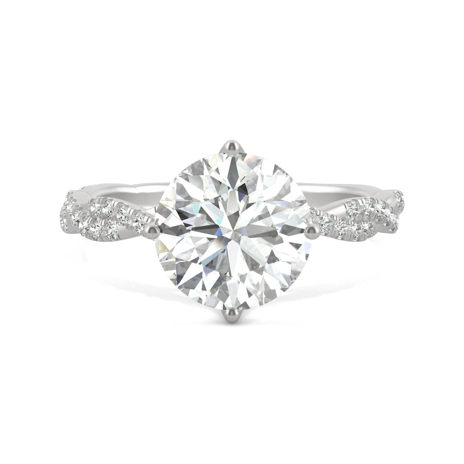 Featuring a brilliantly sparkling 1.9 ct Charles & Colvard moissanite center stone, this ring is sure to draw the best kind of attention! Melee moissanites further enhance its beauty, pave set into a twisting white gold band.