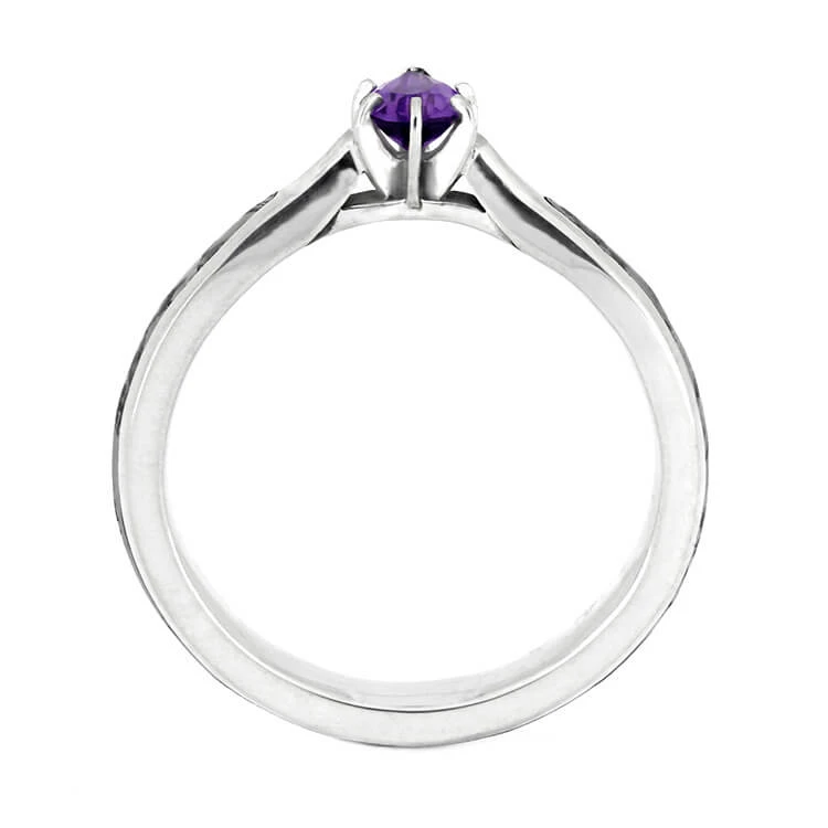 A glistening purple amethyst sparkles atop this meteorite engagement ring. Set in polished sterling silver, this stellar solitaire features an inlay of Gibeon meteorite. This handmade space ring is ideal for astronomy enthusiasts, or for anyone interested in space!