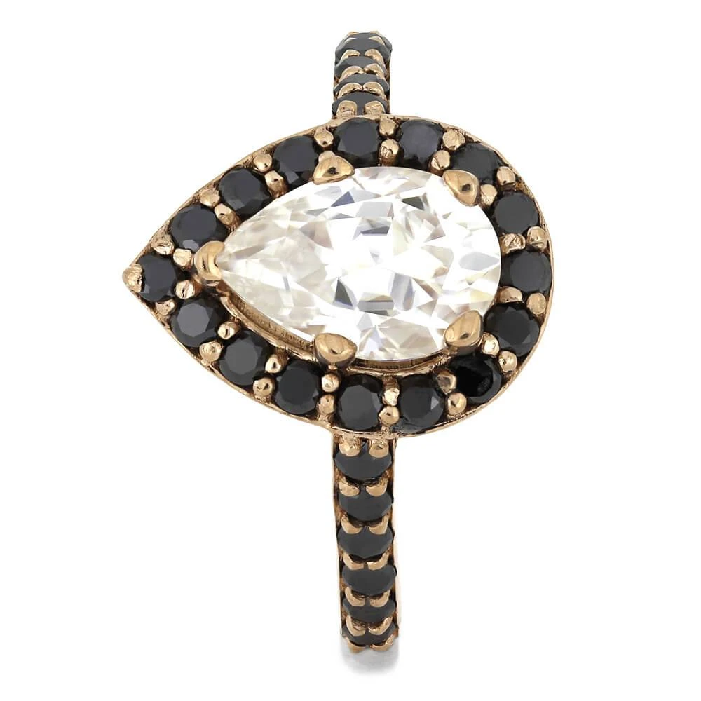 An eye-catching pear shaped moissanite is surrounded by black diamonds in this alternative engagement ring. This stunning, engagement ring is perfect if you’re looking for a unique engagement ring with an edgy look.