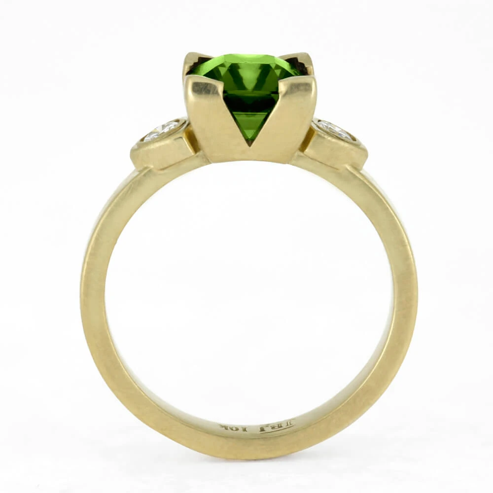 This unique 14k yellow gold three stone engagement ring has a vintage-inspired aesthetic. It features a colorful peridot with moissanite accents. The matte finish gives it a feminine, soft look.