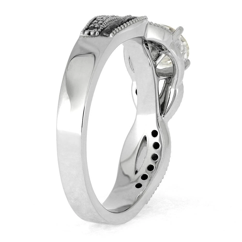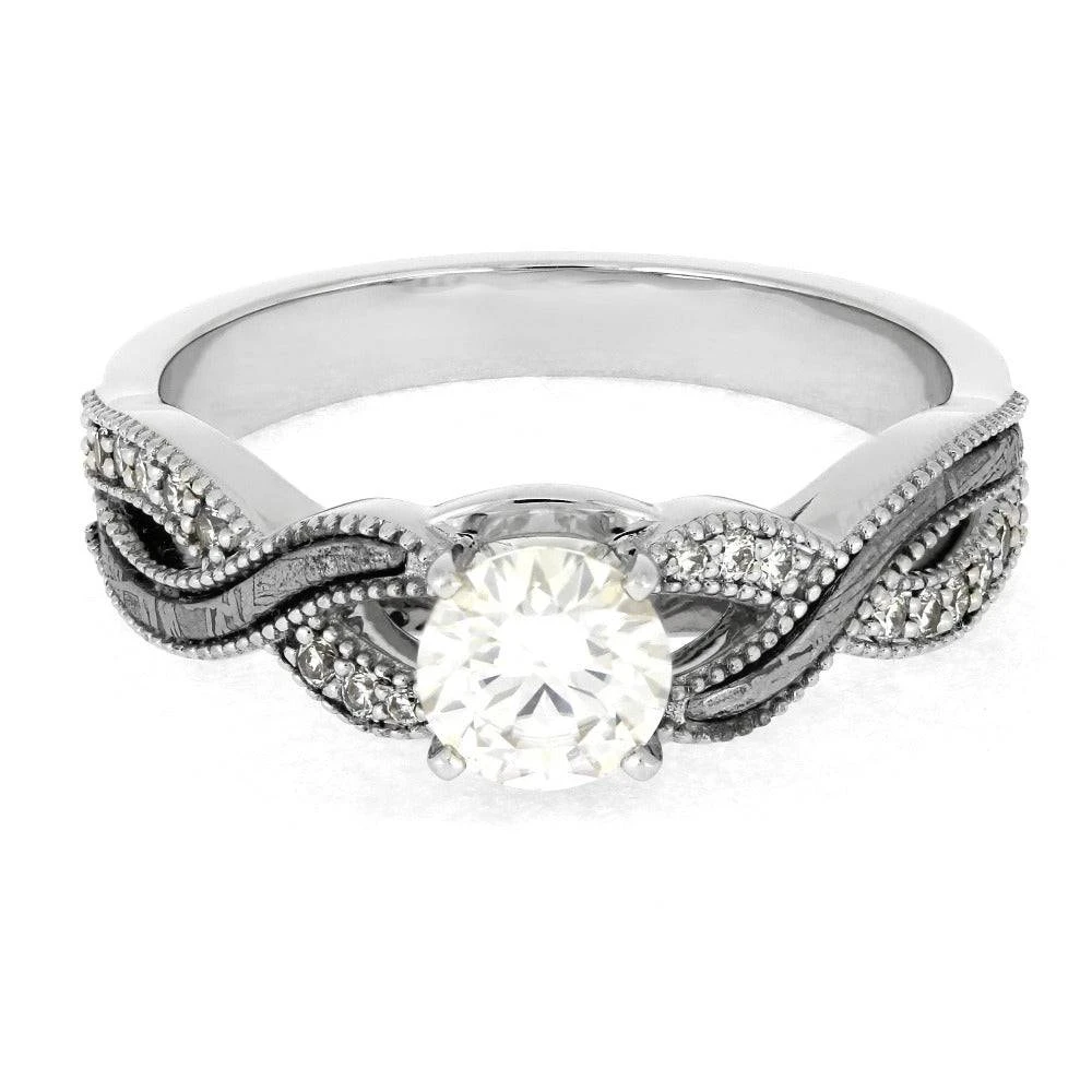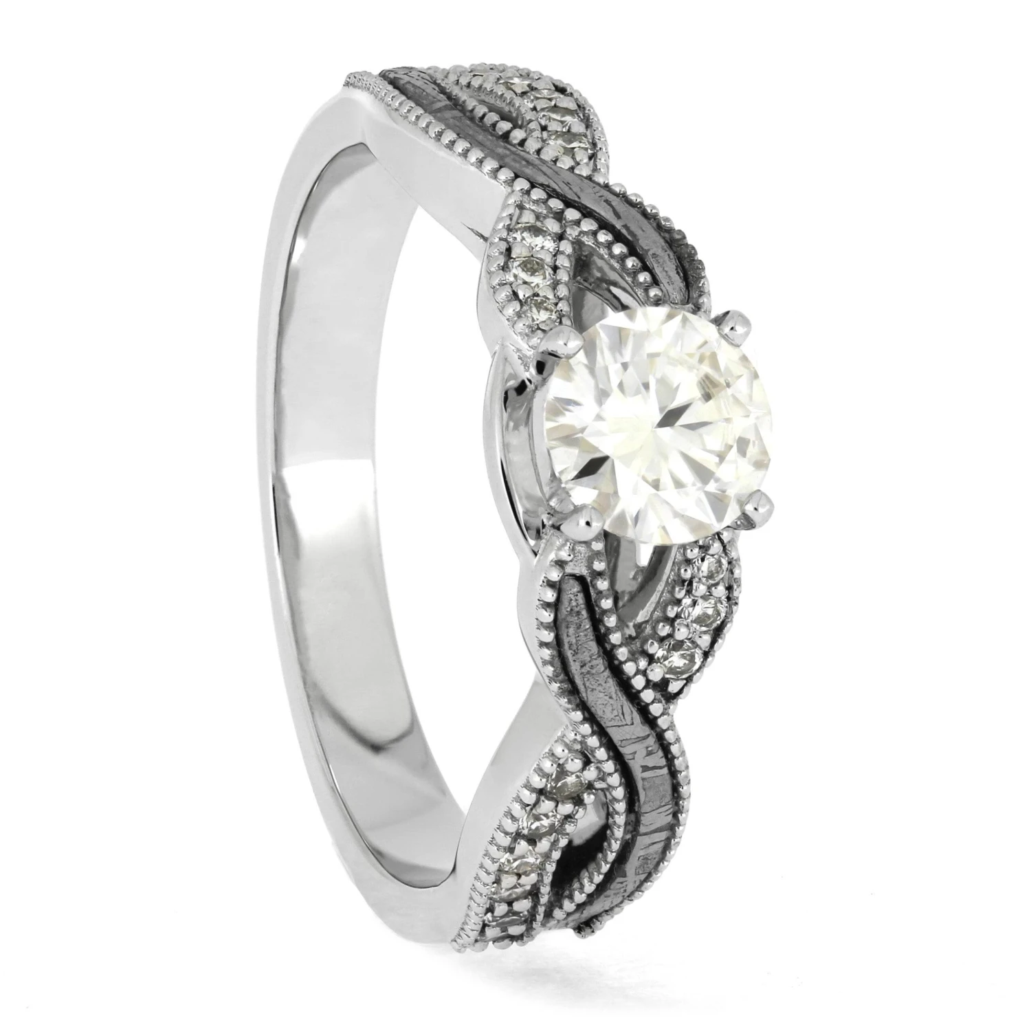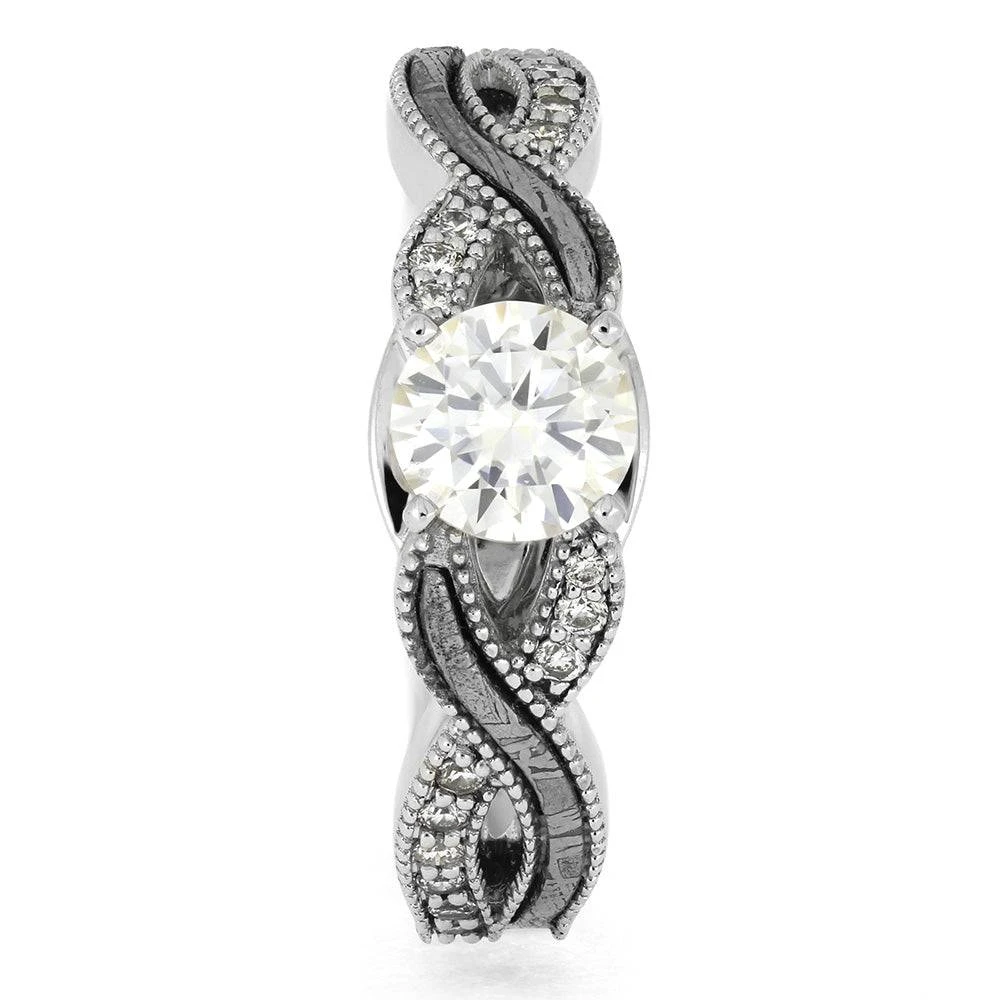 Constructed from solid platinum, this engagement ring features an elegant design with diamonds and Gibeon Meteorite inlays winding along the twisting profile. Wear a real piece of space on your big day, and happily ever after!